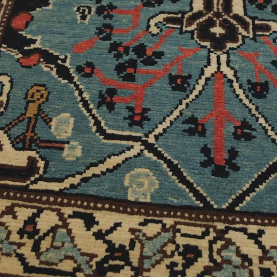 シャー・アッバース時代の複雑なアラベスクや洗練された花瓶のデザインに触発されたゲラスアラベスクラグは、東トルコのアララトラグスの熟練した職人たちによって織りなされた現代の傑作です。19世紀のゲラス地域(旧東クルディスタン)のデザインを受け継ぎながら、ジョセフ・V・マクマランの著書「イスラムの絨毯」に記録された歴史的なイスラム美術の優雅さを体現しています。このラグは、細かく描かれたアラベスクのフレームワークと、くっきりと定義されたパルメットで繋がれたデザインが特徴です。伝統的な花瓶のモチーフは省略されていますが、方向性を持って流れる半自然的な花や灌木のレイアウトは、初期の花瓶カーペットへの敬意を表しています。色彩は、柘榴と藍から作られたネイビーブルー、チョウセンアサガオ、茜根、藍、クルミの実のハスクを混ぜたターコイズを含む8つの調和のとれた色調を使用し、柔らかくも鮮やかな視覚的テクスチャを提供します。