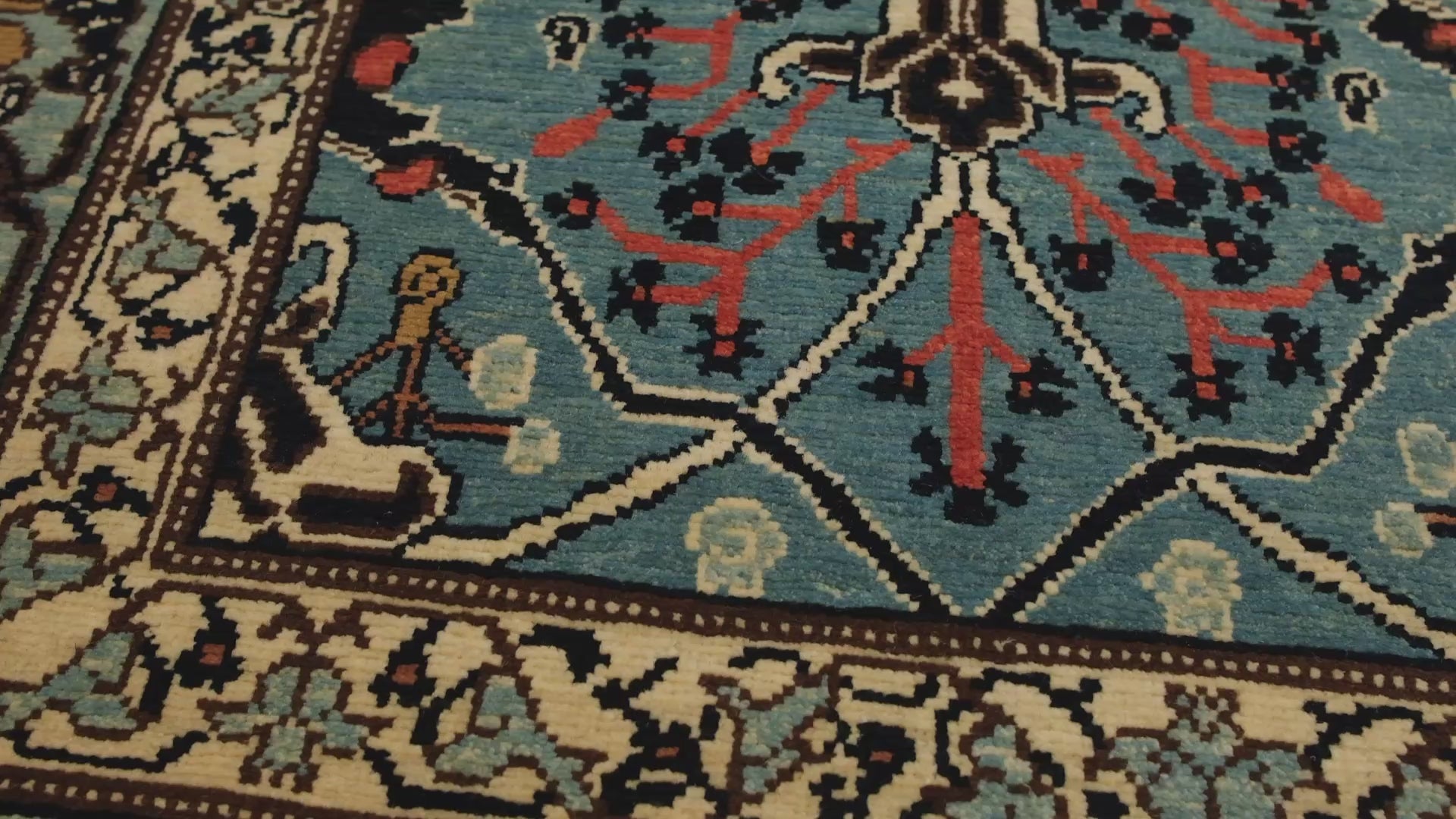 この絨毯は、伝統的な染色方法によって生み出された8色の自然色が調和しています。 Natural Wool Color 320: 羊そのままの色 Natural Wool Color 37: 羊そのままの色 Sunray Color 405: ヘナ Rufous 308: 茜 Dark Salmon 310: 茜 - クルミの殻 Feldgrau 414: カモミール - 藍 Turquoise 330: トウダイグサ - 茜 - 藍 - クルミの殻 Navy Blue 432: 藍 - ザクロの皮