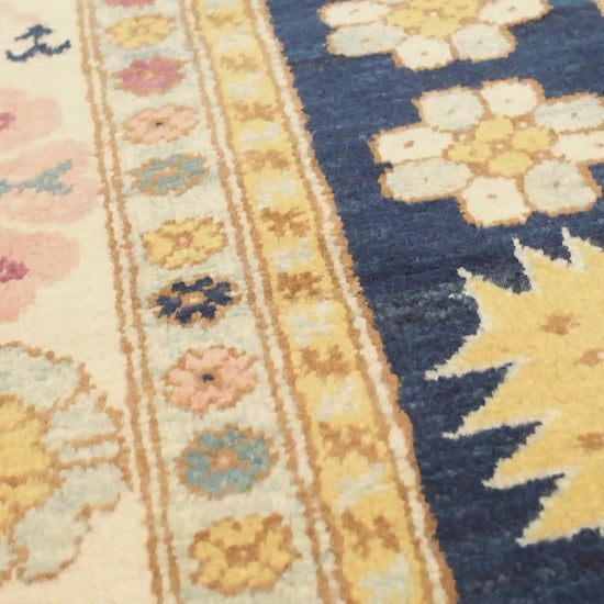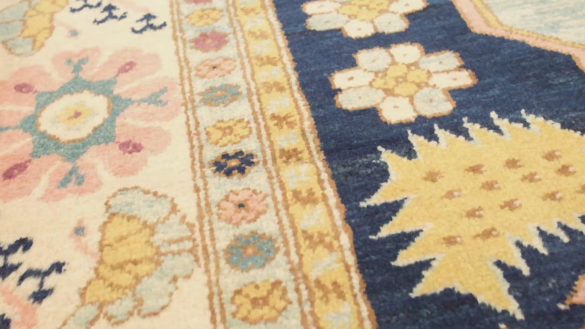 この絨毯は、伝統的な染色方法によって生み出された7色の自然色が調和しています。 Natural Wool Color 320: 羊そのままの色 Pullman Brown 542: クルミの殻 - ヘナ - ザクロの皮 Khaki 413: ホザキモクセイソウ Cameo Pink 436: Synthetic Dye Feldgrau 414: カモミール - 藍 Turquoise 330: トウダイグサ - 茜 - 藍 - クルミの殻 Dark Blue 21: 藍