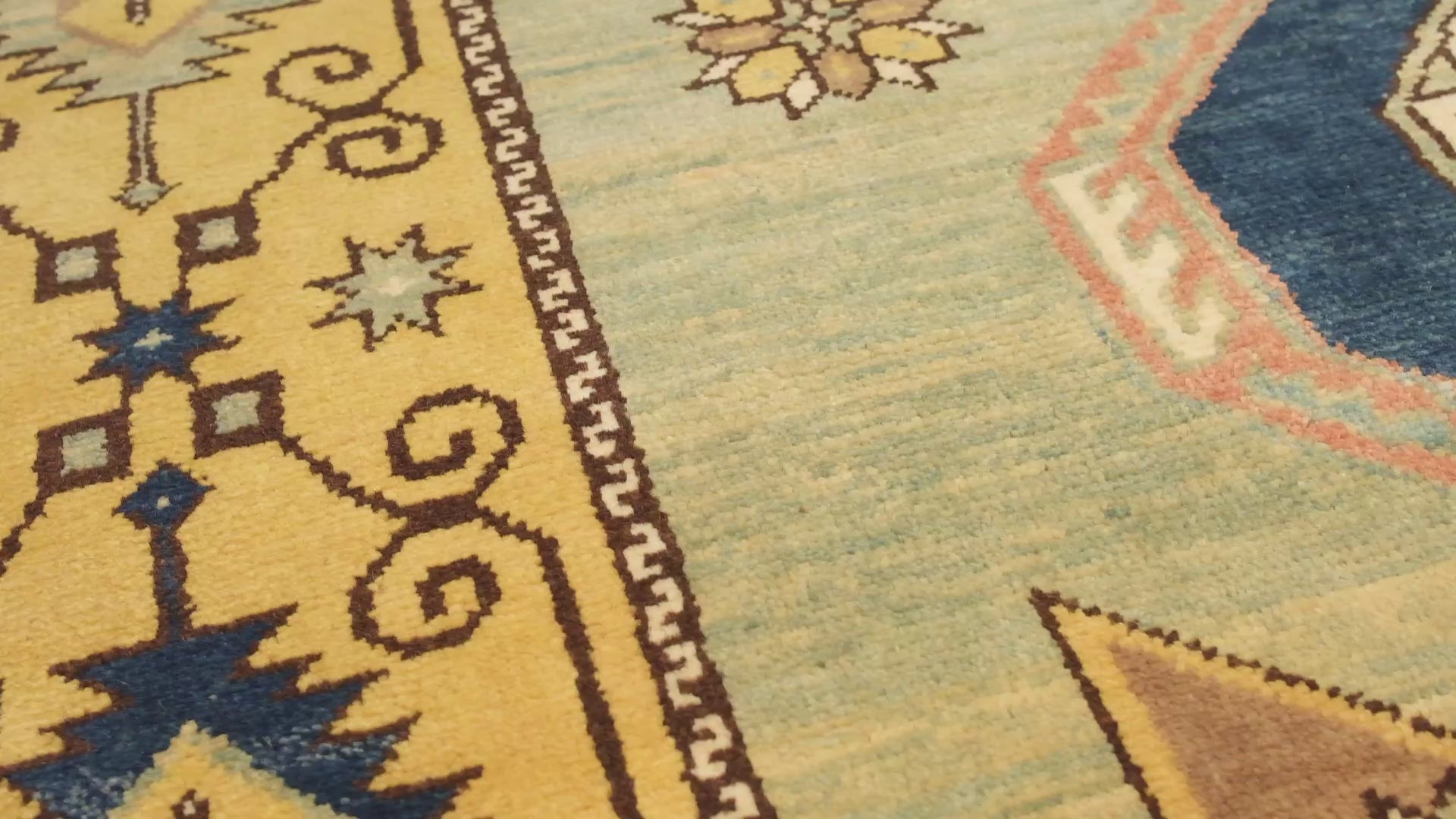 この絨毯は、伝統的な染色方法によって生み出された8色の自然色が調和しています。 Natural Wool Color 320: 羊そのままの色 Burnt Coffee 102: 羊そのままの色 Khaki 413: ホザキモクセイソウ Rooiboos 茶 154: 茜 Arable Brown 430: 茜 Pale Green 439: カモミール - 藍 Moss Green 27: トウダイグサ - 藍 Gunmetal Blue 409: 藍