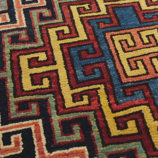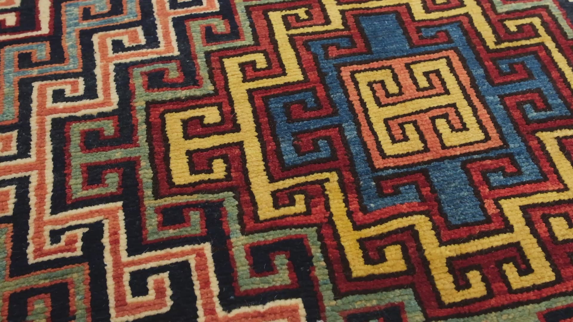 このカザクラグは、19世紀後半のコーカサス地方の伝統的な工芸から着想を得て、東トルコのアララート・ラグにより手織りされました。二つのメダリオンが主要なデザインで、それぞれにフック模様が精緻に織り込まれています。中央のメダリオンはダブルラッチフックのデザインが施され、職人の高い技術が窺えます。メダリオンを囲むボーダーには、「葉と花弁」のパターンが豪華に描かれ、カザクの美学が表現されています。この作品に選ばれた色彩は、ザクロ、スパージ、アカネ根から作られるブラックチョコレート、アカネ根からのマルーン、スパージ、アカネ根、インディゴのブレンドからなるミッドナイトブルー、染料用の草から得られるカーキーが主要な色です。