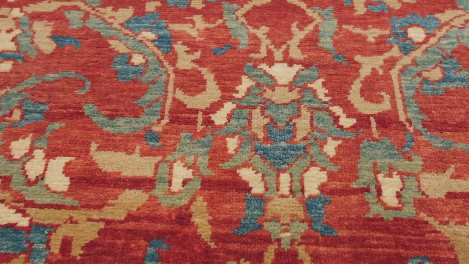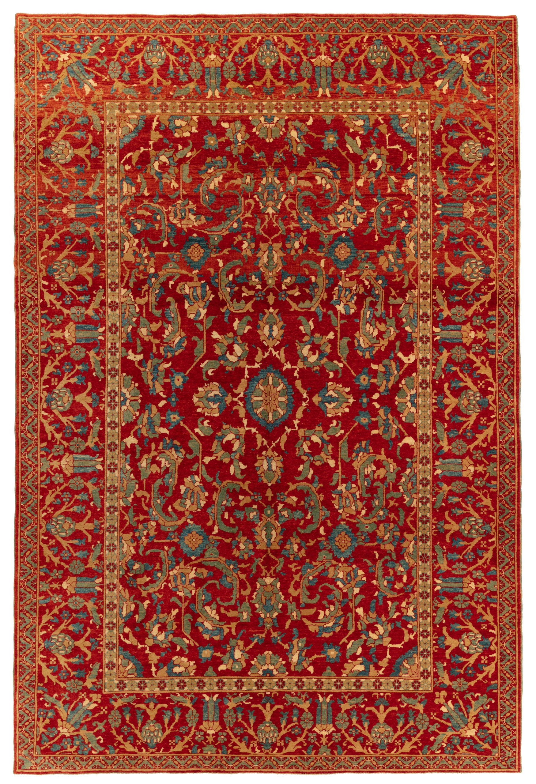 このトルコ宮廷製造絨毯は、16世紀にオスマン帝国によって設立されたエジプトの工房で織られた豪華なデザインの復興を現代に蘇らせたものです。アララト・ラグスの東トルコの熟練職人によって手織りされたこの絨毯は、オスマン芸術遺産に特有の色彩と象徴の鮮やかなミックスを持ち、歴史的な美学を反映しています。オスマン帝国が1517年にエジプトを征服した後、カイロの絨毯織りに目立った変化が生じ、この絨毯に見事に捉えられています。カーネーション、チューリップ、ユリなどの花々が贅沢なパルメットや繊細な花の枝と絡み合い、トルコのタイルやブロケードを彷彿とさせる模様が配置されています。顕著なメダリオンは、しばしば角でエレガントな繰り返しで強調され、このデザインの遺産を強調しています。絨毯のパレットには、茜から得られるインペリアルレッド、ヘナからのサンレイイエロー、ヘナとインディゴの混合によるイエローグリーンが含まれており、歴史的な鮮やかさを現代の趣向に適応させています。