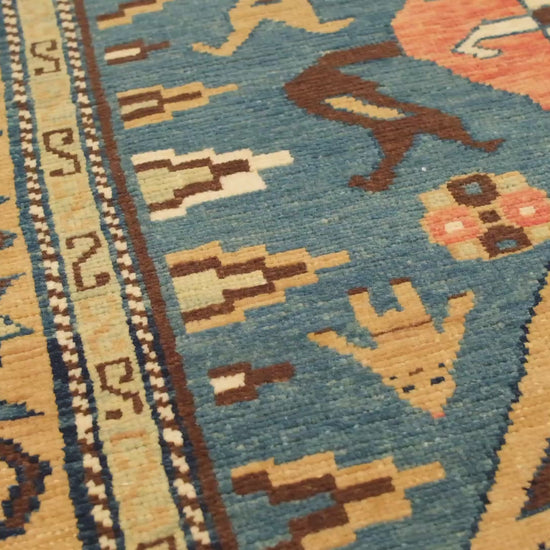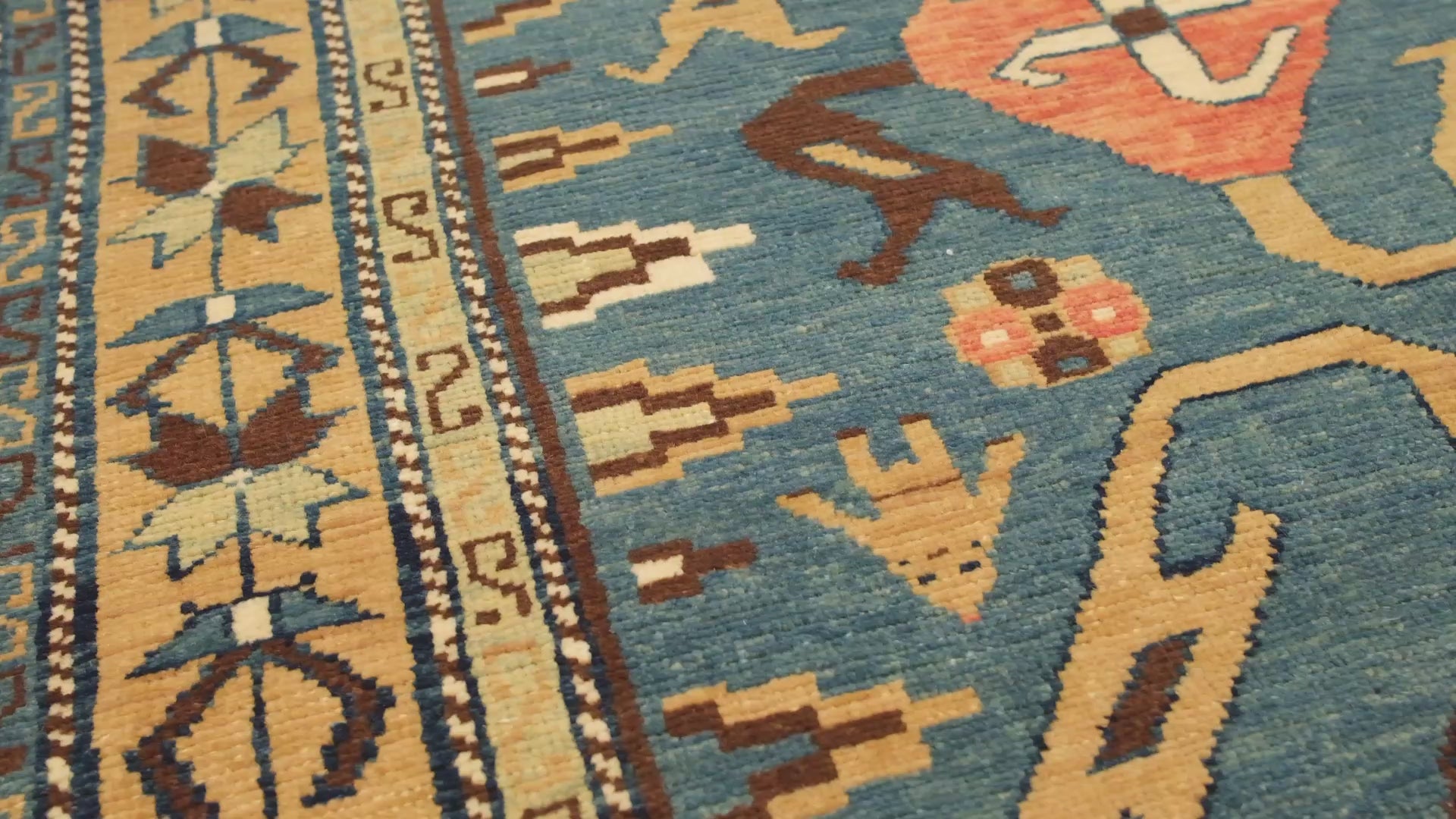 中央コーカサスの初期の19世紀のデザインに触発された、ユニークな卍紋様の敷物をご紹介します。この現代的な作品は、東トルコのアララトラグズにて熟練した職人によって伝統的な技法と自然染料を使用して手織りされています。このデザインは'E. Heinrich Kirchheim の 'Orient Star - A Carpet Collection' に記載されており、他の敷物ではあまり見られない貴重で文化的に重要な卍紋様が特徴です。この紋様はブダペストのイパルミュベーシェティ美術館およびドイツ、アデナウの個人コレクションにある二つのアナトリア刺繍と類似しています。敷物には全7色が使用されており、その中でも特にダークスカイブルー(藍)、サンレイカラー(ヘナ)、チャールストングリーン(トウダイグサと藍の混合)、ナチュラルウールカラーが目立っており、柔らかながらも印象的な美しさを創り出しています。