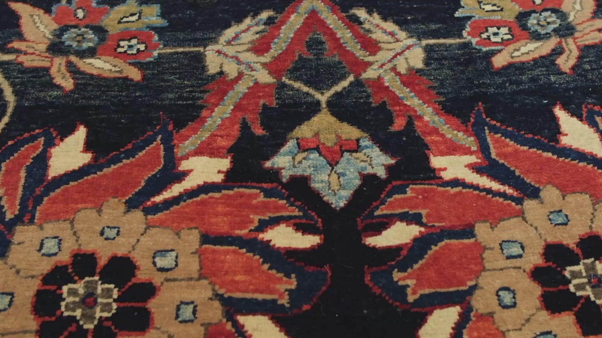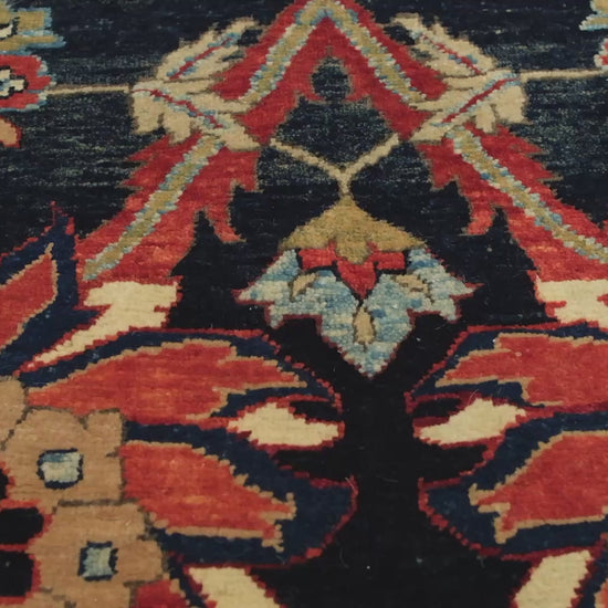 17世紀ペルシアの伝統的デザインから着想を得て、アララト・ラグスがお届けする「ケルマン花瓶技法カーペット」は、シャー・アッバースの治世(1587-1625年)にケルマンで製作された歴史的なカーペットに敬意を表した現代的な再解釈です。自然なインディゴとザクロ染料で染められた深いネイビーブルーの背景に、大きなパルメットとドラマチックに曲がる鎌形の葉の横並びと縦並びの菜食モチーフが輝いています。細かい模様の境界線は、茜根を使用した帝国赤の色合いでコイルと花で装飾されています。東トルコで伝統的な手織り技術を用いて製作されたこのリバイバルピースは、ペルシアの芸術の本質を捉え、現代の鮮やかな色合いを11色の独特な色彩パレットの中で紹介しています。