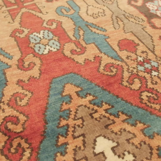 アララトの熟練した職人に東トルコで手織りされたセイラーサルキスララグは、中央アナトリアのシヴァスに位置するサルキスラ地域から始まった歴史的なデザインの現代的な復活です。このラグは、'オリエント・スター – カーペット・コレクション'(E. ハインリッヒ・キルヒハイム著)に記載された17世紀のカーペット伝統から着想を得て、船乗りの錨と囲まれた一連のフック付きメダリオンを繊細に描きます。それぞれのメダリオンは格子状の作業に囲まれ、このタイプの最古の既知の例を彷彿とさせます。このラグは、サーモン(マダールートによる染色)、ビストルブラウン(ザクロがマダールートと混ざる)、マルーン(マダールート)、オパール(ヘナとインディゴ)など、自然な8色の和やかな調和を特徴とし、古代のモチーフを現代的な美学で活気づけるために入念に選ばれました。