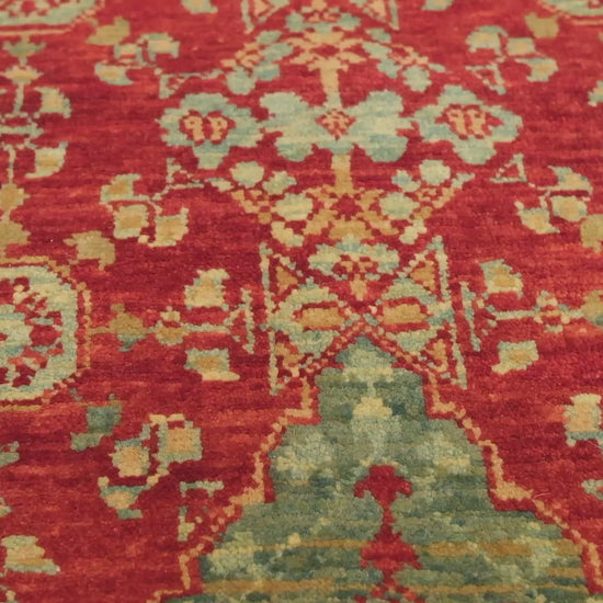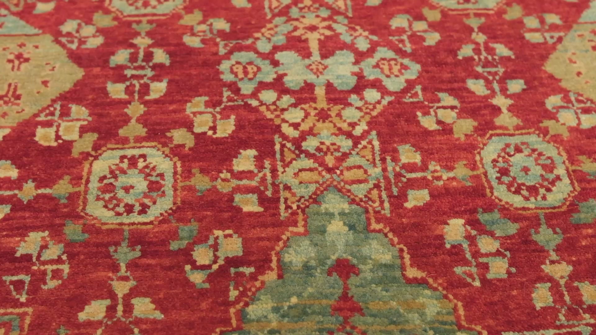 この絨毯は、伝統的な染色方法によって生み出された4色の自然色が調和しています。 Sunray Color 405: ヘナ Imperial Red 426: 茜 Pale Green 439: カモミール - 藍 Yellow Green 419: ヘナ - 藍