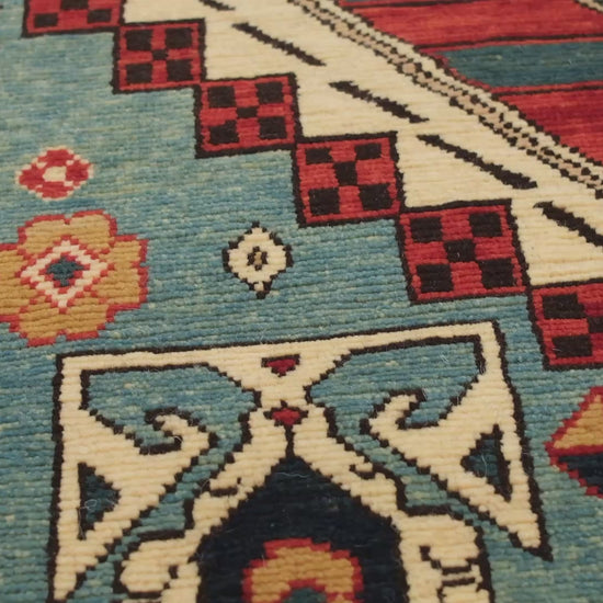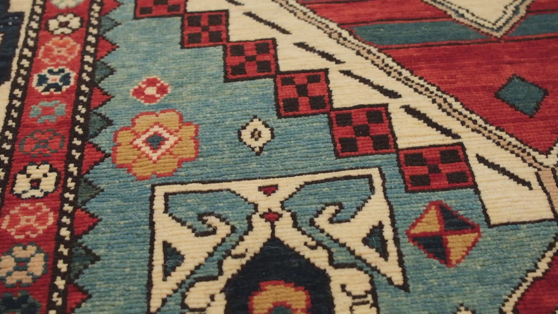 19世紀後半のカフカースの伝統的な織り手法に触発されたこの現代のシルヴァンラグは、古典的な構成を復活させています。東トルコのアララト・ラグズで熟練した職人により手織りされた本作品は、伝統的な技術と天然染料を使い、まった根から抽出されたインペリアルレッドや藍草から得たカデットブルーが使用されています。デザインは対称的なステップエッジの連結六角形モチーフが縦列に配置されており、フラットな鋸刃のようなメダリオンがエジプトやペルシャの王室の古代の紋章を思わせます。さらに動物、鳥、人間の姿などが深みと文化的意義を加え、ダークブルーのフィールドを豊かに彩ります。黄色の地に'S'の連結モチーフを配したボーダーは北ペルシャの部族や村の敷物に見られる特徴であり、異なる敷物製作地域間の歴史的交流を現代に伝える豊かなタペストリーを提供します。