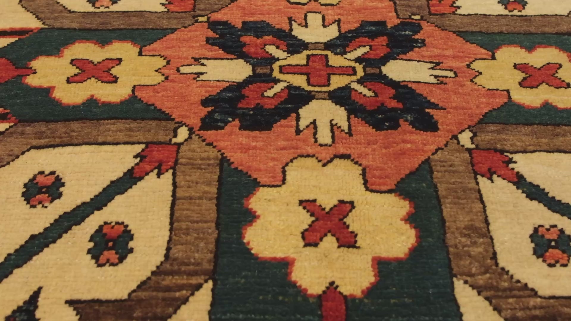 この絨毯は、伝統的な染色方法によって生み出された8色の自然色が調和しています。 Natural Wool Color 320: 羊そのままの色 Black Chocolate 434: ザクロの皮 - トウダイグサ - 茜 Gold 429: Reseda Luteola Imperial Red 426: 茜 Congo Pink 306: 茜 Arable Brown 430: 茜 Pine Tree 420: ヘナ - 藍 Navy Blue 432: 藍 - ザクロの皮