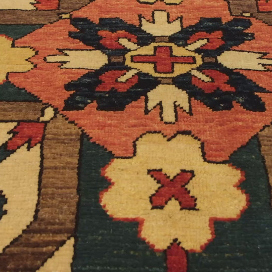 チェラベルド・カラバフラグは、東トルコのアララトラグズの熟練した職人によって手織りされた、歴史的なコーカサスの芸術を現代的に再解釈した優れた作品です。このラグは、カラバック地方の伝統的なチェラベルドデザインに敬意を表しており、鮮やかな赤い背景に大きなメダリオンが特徴です。花が付いた十字形のモチーフは、飛ぶ鳥、輝く太陽、十字の剣、または高貴な紋章として歴史的に様々に解釈されています。この現代的なラグは、インペリアルレッドのマダー・ルート、自然の羊の色、ザクロ、トウダイグサ、マダー・ルートのブレンドであるブラックチョコレート、レセダ・ルテオラのゴールドを使用し、古代の染色伝統と環境への配慮を実現しています。