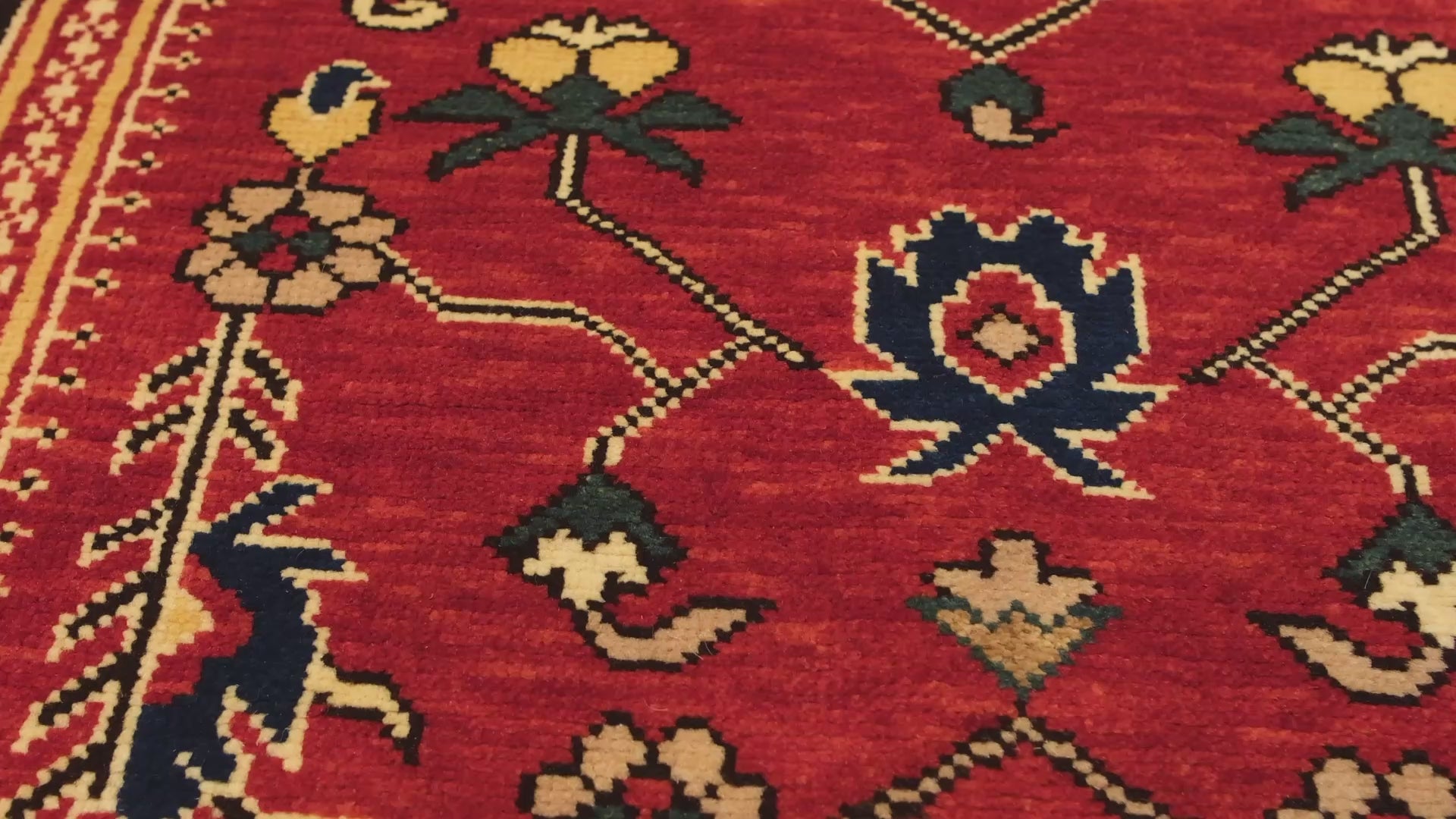 この絨毯は、伝統的な染色方法によって生み出された8色の自然色が調和しています。 Natural Wool Color 320: 羊そのままの色 Dark Brawn 316: 羊そのままの色 カラー549 549: Source unknown カラー323 323: Source unknown Tawny Olive 538: モクセイソウ - 茜 Imperial Red 426: 茜 Russian Green 418: ヘナ - 藍 Green Blue 344: トウダイグサ - 茜 - 藍