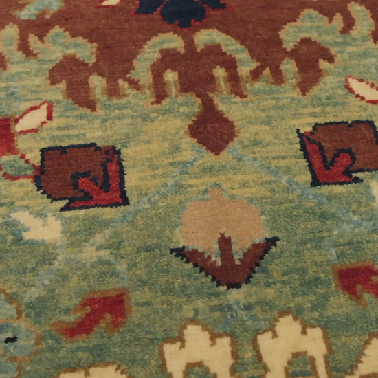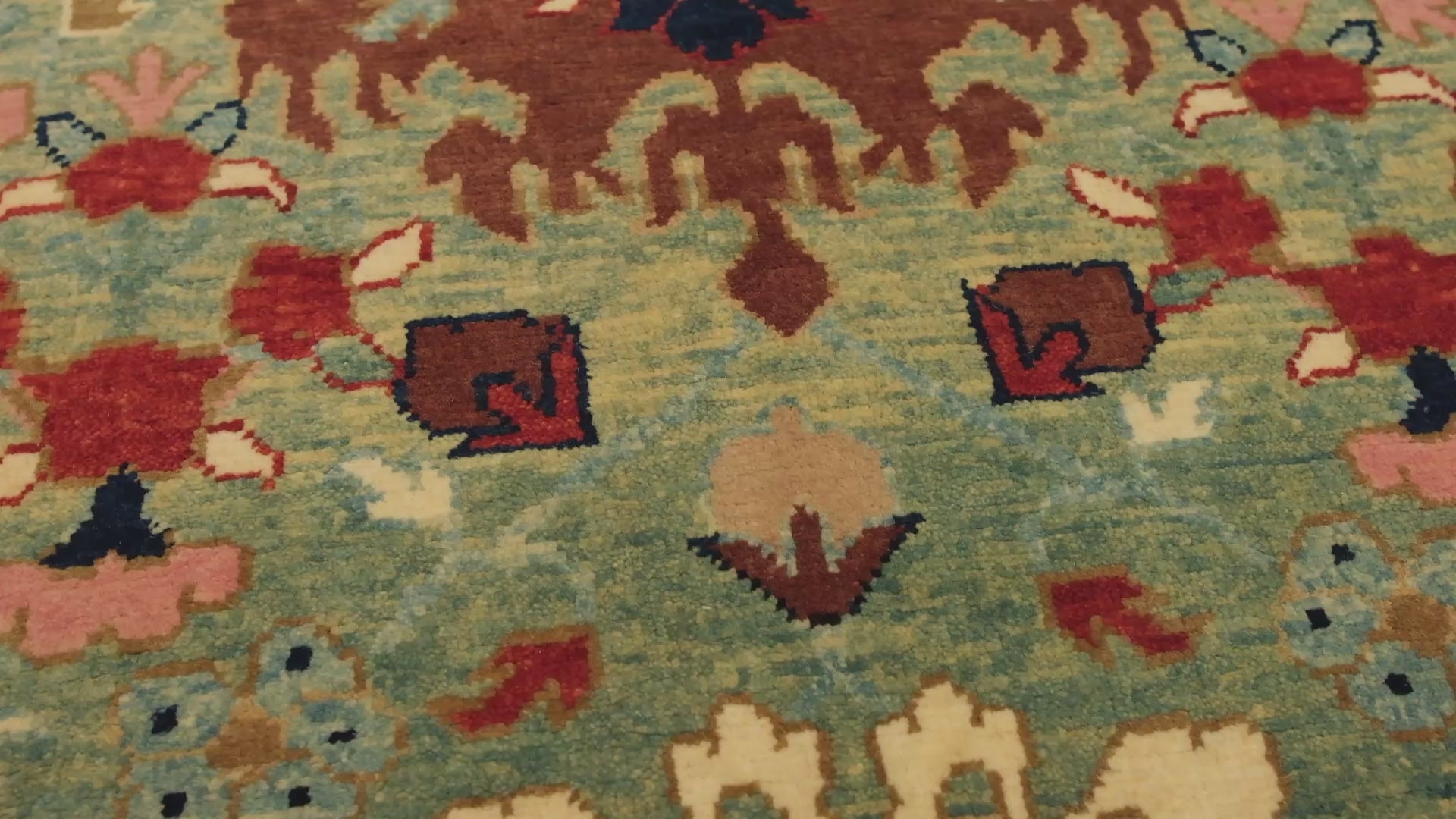 この絨毯は、伝統的な染色方法によって生み出された12色の自然色が調和しています。 Natural Wool Color 320: 羊そのままの色 Dark Brawn 316: 羊そのままの色 Sunray Color 405: ヘナ Kumera 326: ザクロの皮 - トウダイグサ - 茜 カラー116 116: Source unknown Imperial Red 415: 茜 Cameo Pink 436: Synthetic Dye Dark Sienna 402: 茜 - ザクロの皮 - トウダイグサ - クルミの殻 Emerald Green 407: カモミール - 藍 Pale Green 439: カモミール - 藍 Turquoise 330: トウダイグサ - 茜 - 藍 - クルミの殻 Dark Blue 21: 藍