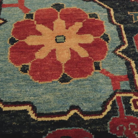 東トルコの熟練した職人によって手織りされた「パルメットと花の格子状ラグ」は、歴史的なデザインを現代的に再解釈した作品です。17世紀ヘラートのヴァース技法のカーペットに着想を得たデザインは、大きな側面のパルメットを中心に小さな花のメダリオンとダイアモンド形のカルトゥーシュが交互に配置され、かつて東クルディスタンやコーカサスで栄えた美学を反映しています。丁寧に配置されたパルメットと花の模様は、視覚的な調和の豊かなタペストリーを形成します。マダールートを使用した鮮やかなマルーン、インディゴとザクロの混合で深いネイビーブルー、ロシアングリーンとジンジャーチャーチを加えた、合計11色の色彩が複雑なデザインに生命を吹き込みます。伝統的なモチーフを称えるボーダーは、カルトゥーシュと星形メダリオンの連続で構成され、角張った葉のメアンダースクロールでフレームされています。