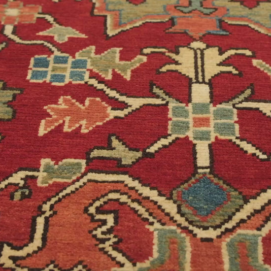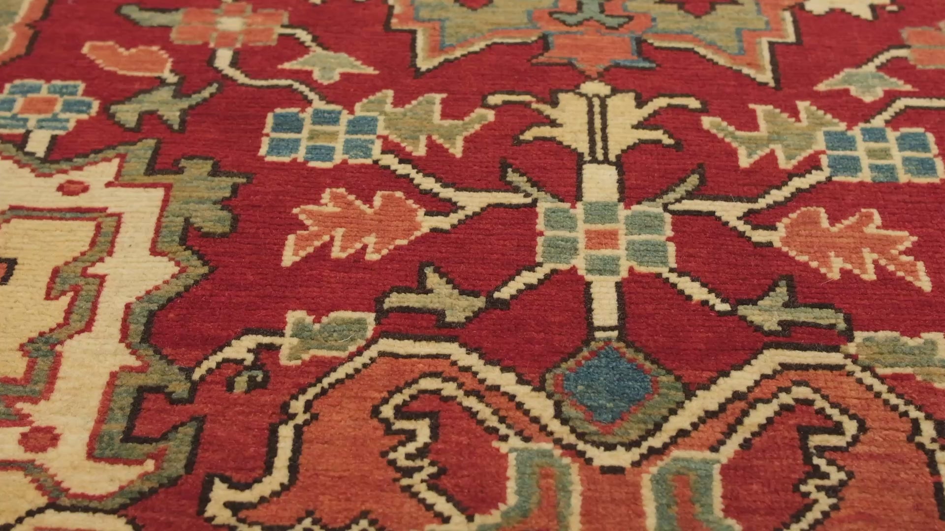 このヘリズ・メダリオン・ラグは、エアラット・ラグスの東トルコの熟練した織り手によって仕立てられた、19世紀後半の伝統的なヘリズのデザインの現代的な再解釈です。このラグは、ロータス・パルメット、鎌の葉、格子、そして樹木のモチーフなど、伝統的なペルシャの装飾が特徴のメダリオン・パターンを採用しています。古典的な直線技法と自然の染料で染めた鮮やかな色合いを融合し、純粋なウール100%で一本一本手織りされています。帝国赤、ココアブラウン、ミッドナイトブルーなど、マダー・ルート、カモミール、インディゴを含む自然染料で実現した10色のパレットがこのラグの魅力をさらに際立たせています。各ラグは、時代を超越したペルシャの要素と現代の芸術性の純粋さとユニークさが融合した作品です。