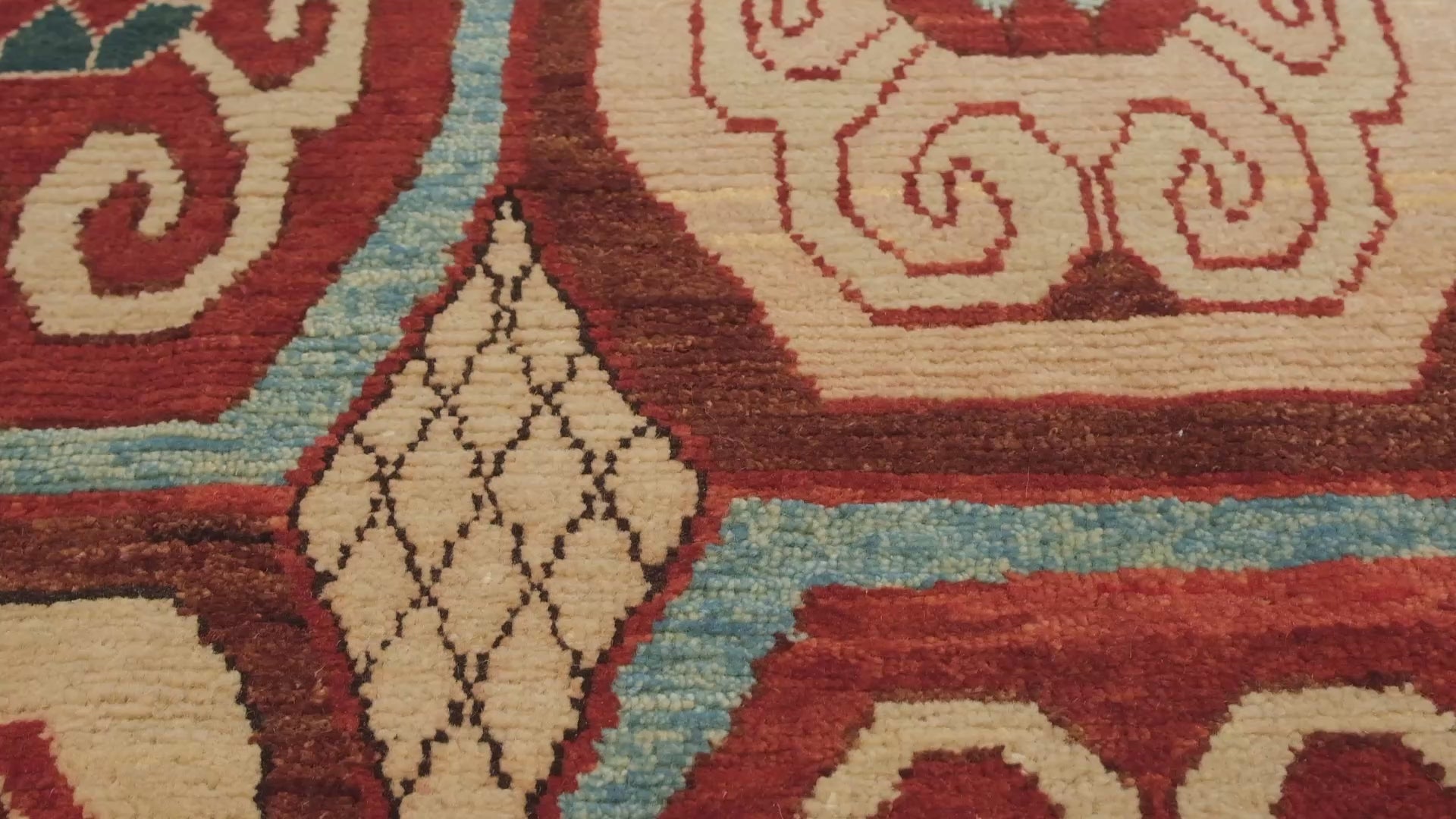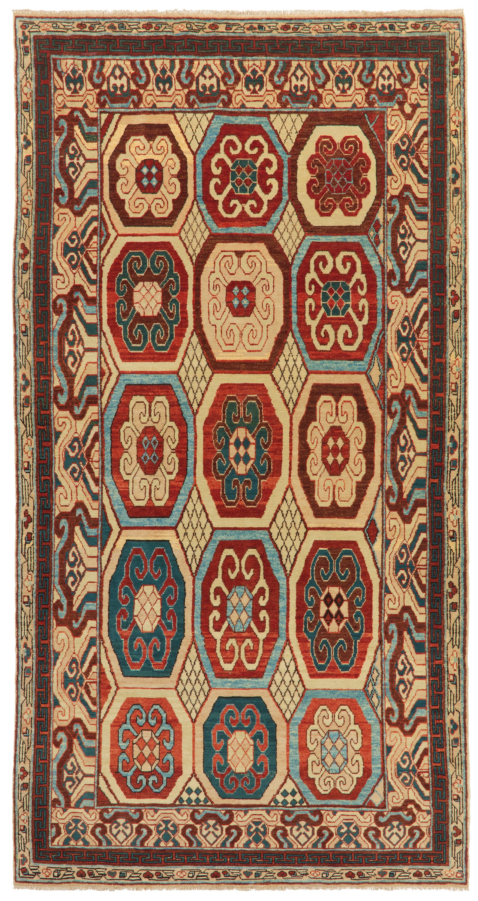 シルクロードの歴史にインスピレーションを受けたこの手結びのホータン絨毯は、東トルキスタンの豊かな織物遺産の現代的な再解釈です。中国の雲帯、中央アジアのザクロのモチーフ、ペルシャの格子縞と融合し、ホータン織の独特な文化的境界を越えたタペストリーを創り出します。この絨毯の構成は控えめでありながら象徴的な深さを持っており、中央のメダリオンまたは繰り返される要素が流れるような花のボーダーによって囲まれています。手紡ぎのウールを使用し、自然な植物染料で色付けされたこの絨毯は、柔らかなベージュ、褪せた赤、淡い青、控えめなグレーといった暖色系のパレットを採用しており、その普遍的な魅力を引き立てます。伝統的な空間にもモダンな空間にも最適なこの絨毯は、ミニマリスティックな優雅さと歴史的な魅力を現代の洗練されたインテリアのために再生します。