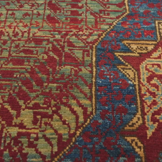 この「中央星付きマムルークラグ」は、16世紀初頭のカイロのマムルーク朝の芸術性を復興した現代の作品です。東トルコの熟練した職人によって手織りされたこのデザインは、宮廷の設定を飾ったオリジナルピースを思わせる、幾何学的パターンのリッチなモザイクを反映しています。対称的な結び目と自然染料の選択による精密な職人技が顕著で、歴史的技法を反映しています。 このラグは、S撚りのウールを特徴としており、一般的に見られるZ撚りのウールに比べ、伝統的なカイロ工房の手法を表しています。4つの慎重に選ばれた色(ミックスカラー、ブラックチョコレート、ジェリコジェイド、モスグリーン)が合わさり、柘榴、トウダイグサ、茜根、藍などの天然素材を使用して色彩の深みと繊細さが保たれ、その表面に広がる独特な幾何学的モチーフを強調しています。 歴史や職人技の愛好家に理想的なこのラグは、実用的な工芸品であると同時に、マムルーク美学の本質を現代の空間にもたらす生きた歴史の一部です。