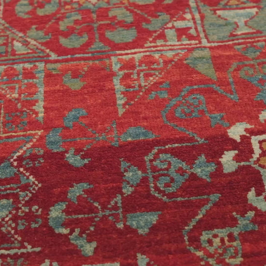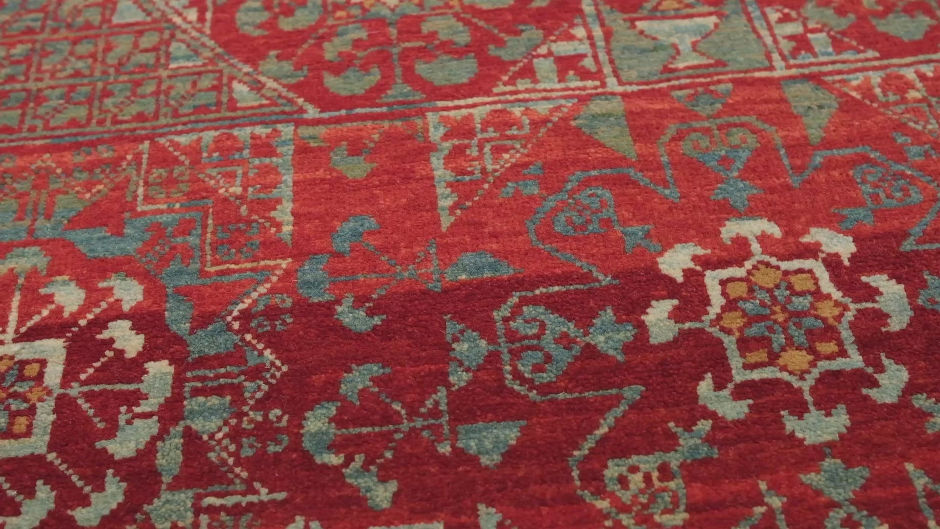 15世紀後半のカイロに源を発するマムルーク芸術に敬意を表したこの新しいマムルーク絨毯は、歴史的工芸品に触発された独特なカップモチーフデザインを特徴としています。特有の配置は、その精密な構造と装飾的な詳細で知られる小さくほぼ正方形のマムルーク絨毯を反映しています。中央のフィールドを囲む広いボーダーは、視覚的に調和のとれた幾何学的アンサンブルを作り出す三角形の角によって遮られた中央の八角形で巧みに分割されています。この八角形は、心臓部に多花弁のロゼットを内包する魅力的な青い多葉のメダリオンを導入し、優雅に放射状に広がる精巧な花の小枝で囲まれています。古代からの美的感覚を高めるため、角にはスタイリッズドされた蓮の花のモチーフが特徴的なチェッカーボードパターンが展示されています。トルコ東部でArarat Rugsによって伝統的な織り技術を用い、すべて天然の染料を使用して手織りされています。これには、Sunray(405 ヘナ)、Moss Green(27 スプルージ - インディゴ)、Yellow Green(419 ヘナ - インディゴ)、Imperial Red(415 マダールート)が含まれ、魅力的なデザインを優しいが鮮やかな色彩で豊かにしています。
