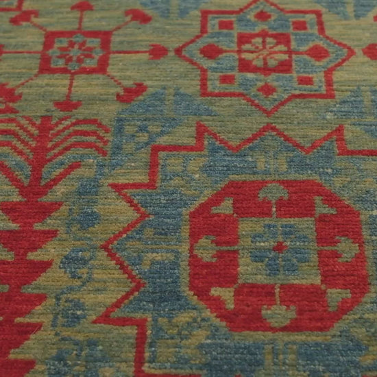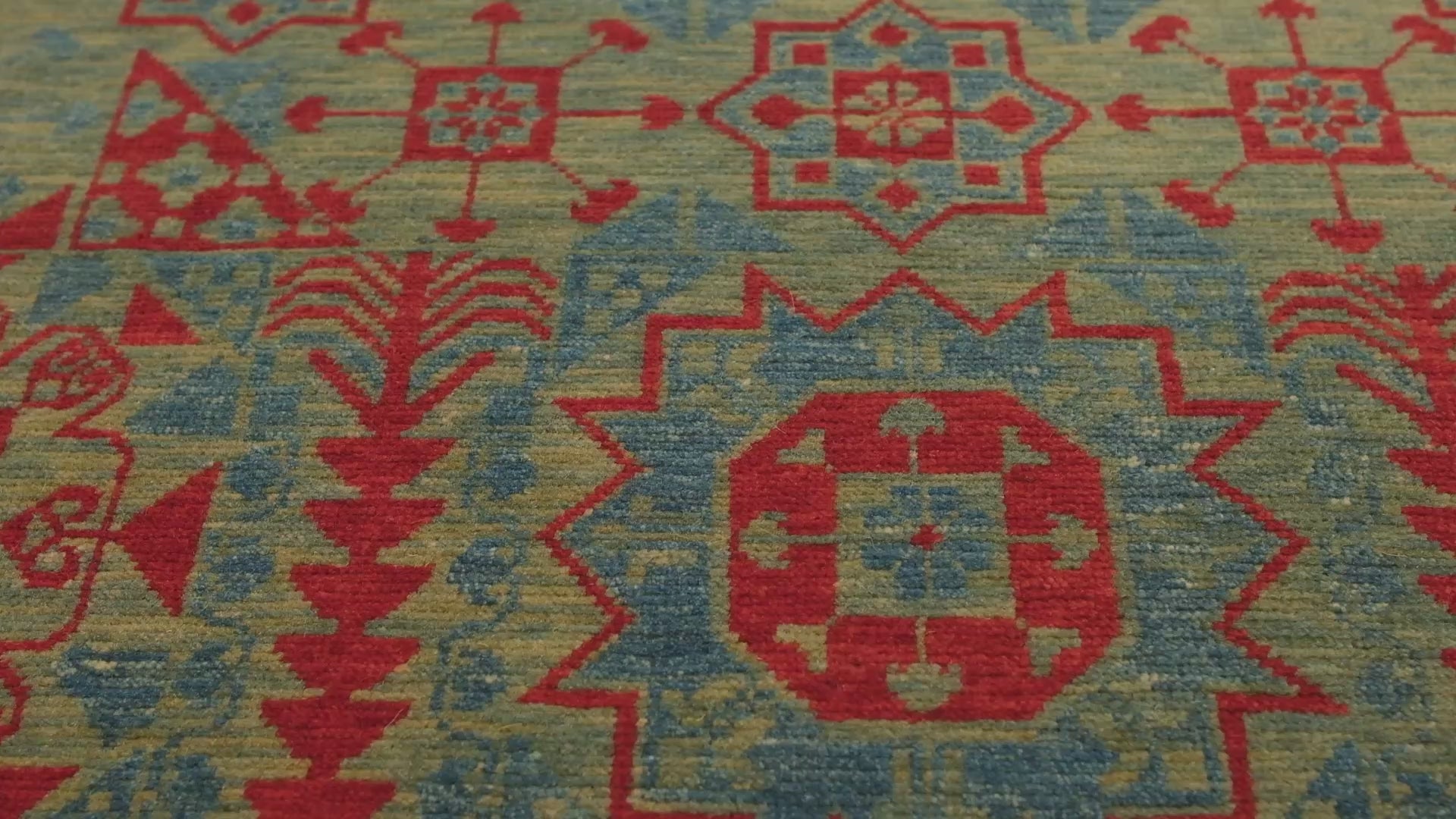 この絨毯は、伝統的な染色方法によって生み出された3色の自然色が調和しています。 Imperial Red 415: 茜 Yellow Green 419: ヘナ - 藍 Cadet Blue 26: トウダイグサ - 藍