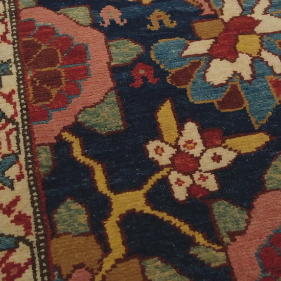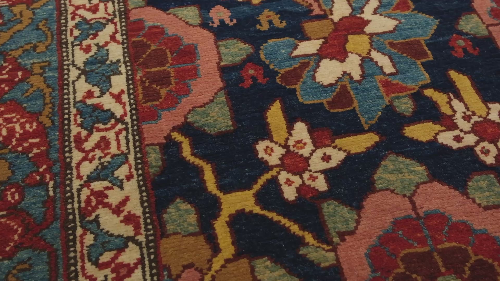 このミナ・カニ・ラグは、トルコ東部のアララト・ラグスの職人によって手織りされ、ジェームズ・D・バーンズによる「クルディスタンのアンティーク・ラグ: 織られたアートの歴史的遺産」に詳述された19世紀中頃の特別なデザインにインスピレーションを得ています。ラグは南クルディスタンで一般的なミナ・カニ・格子パターンを特長とし、アスターの花の列が円形の蔓やツタと連結され、古典的なビジャール・ボーダーに囲まれています。この復刻版は、原作の部族の本質を称えるだけでなく、フェニックス・レッド、マダー・ルート由来のインペリアル・レッド、スポルジとインディゴのキャデット・ブルーを含む10種の天然染料で鮮やかな色彩を用いて、それぞれの色が深みと本物らしさを放つように強化しています。