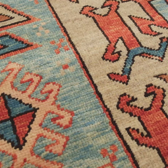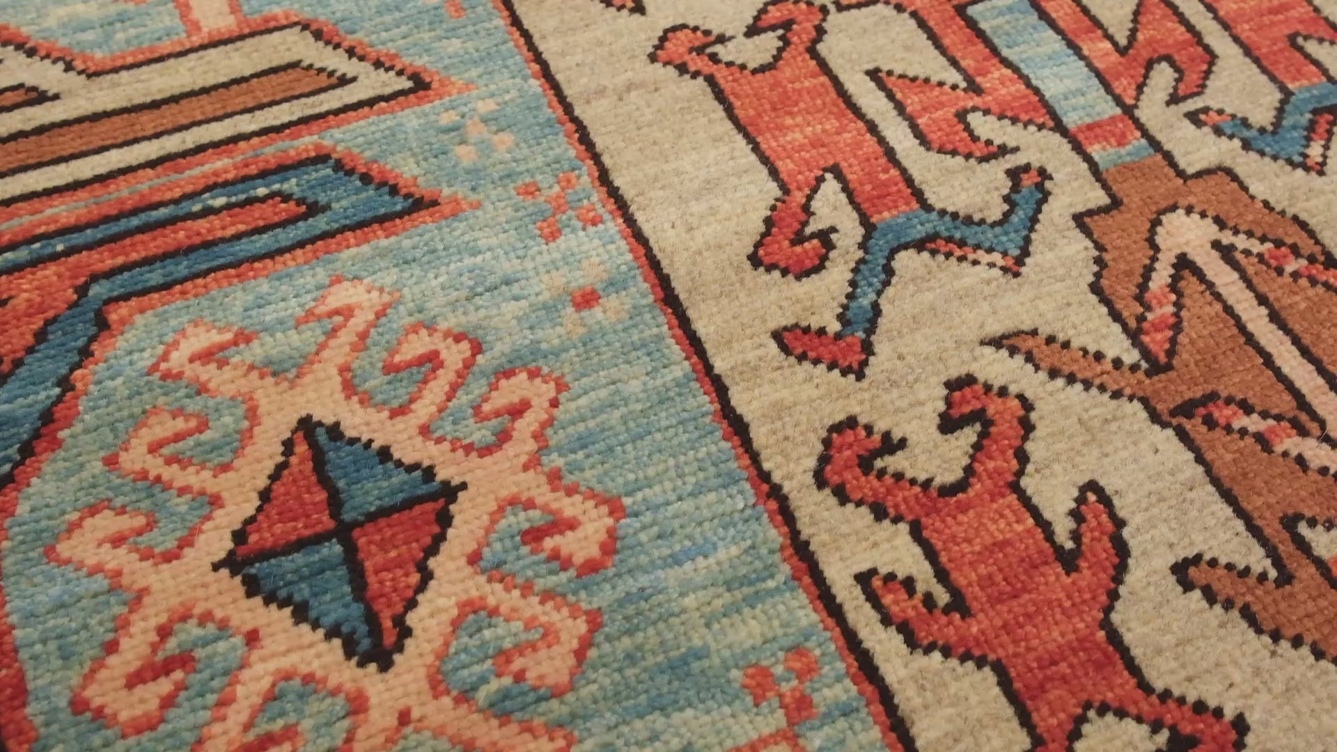 16世紀から17世紀のサファビッド朝ペルシアで初めて現れた精緻な「鎌葉」と呼ばれるデザインを受け継ぐレンコランラグは、伝統的な技法を駆使して東トルコのアララト・ラグスの熟練職人によって手織りされています。現代的な解釈と伝統的なコーカサス地方のモチーフが調和するこのラグは、染料として使用されているマンダリンオレンジ(茜の根から)、ビダリアの深い青(藍から)、自然な羊毛のダークブラウンやバーリーコーンの色合いが特徴です。流れるような葉っぱのパターンで知られる歴史的に大切されるサズスタイルを反映したデザインが施されています。