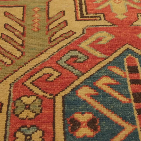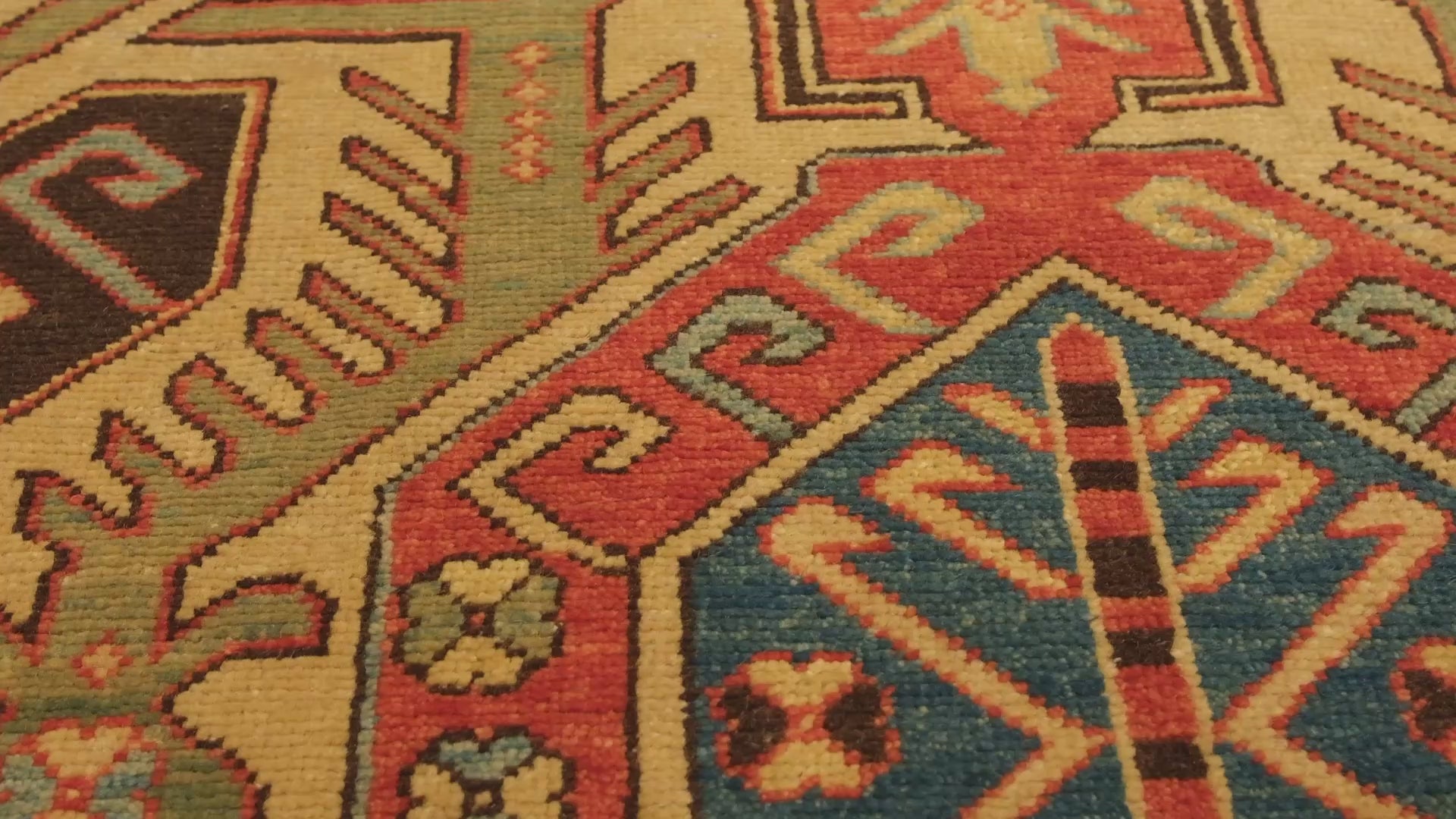 この絨毯は、伝統的な染色方法によって生み出された7色の自然色が調和しています。 Bistre Brown 411: ザクロの皮 - 茜 Khaki 413: ホザキモクセイソウ Venetian Gold 535: Gall Oak Rufous 308: 茜 Yellow Green 419: ヘナ - 藍 Moss Green 27: トウダイグサ - 藍 Cadet Blue 26: トウダイグサ - 藍