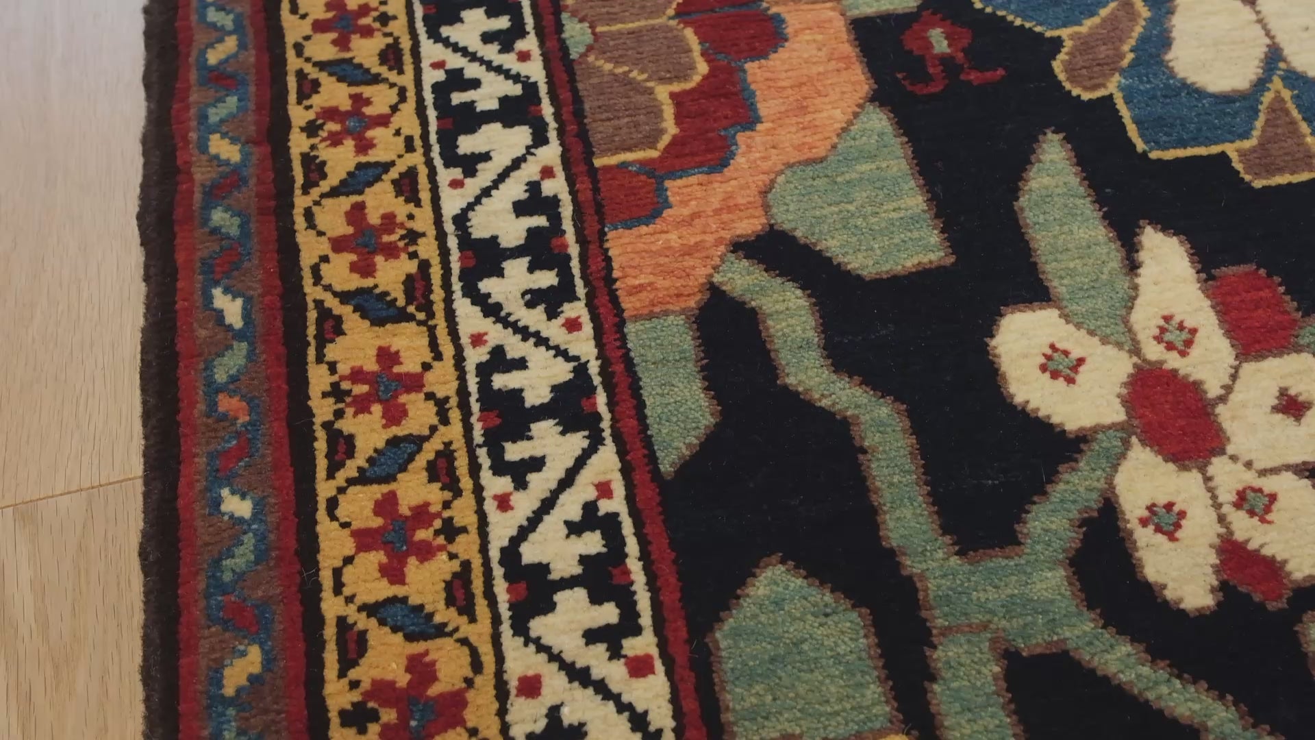 この絨毯は、伝統的な染色方法によって生み出された9色の自然色が調和しています。 Natural Wool Color 320: 羊そのままの色 Dark Brawn 316: 羊そのままの色 Tawny Olive 538: モクセイソウ - 茜 Baby Pink 146: 茜 Imperial Red 415: 茜 Congo Pink 306: 茜 Emerald Green 407: カモミール - 藍 Dusty Turquoise 340: トウダイグサ - 茜 - 藍 - クルミの殻 Navy Blue 432: 藍 - ザクロの皮