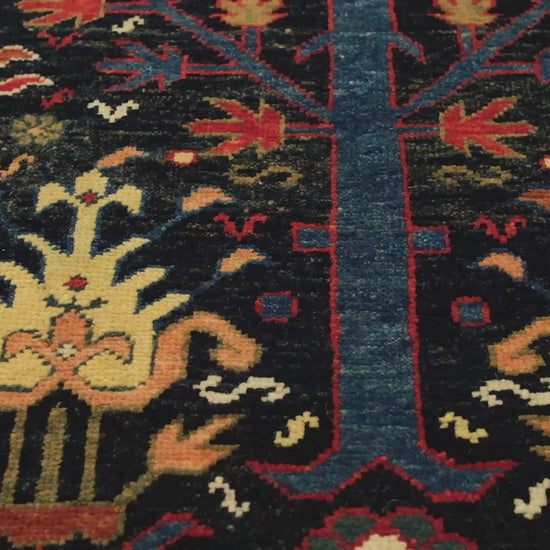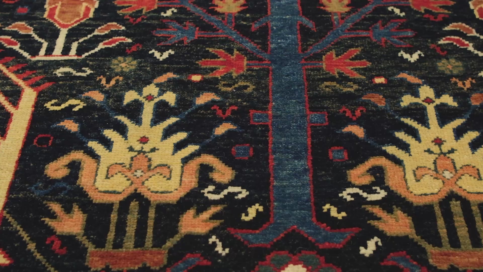 17世紀のクルドの名作、サウジュ・ブラーグの伝統を受け継ぎ、東トルコの熟練したアララット・ラグの職人によって手織りされた「ビッド・マジュナム・オン・ブルー・フィールド・ラグ」は、現代的な再解釈を加えた作品です。このラグは、「柳を嘆く」意味を持つ伝統的なモチーフ「ビッド・マジュナム」を採用し、歴史的な響きと現代のクラフトマンシップを見事に融合させています。サイプレス、ウィロー、チェリー、プレーンの四種の木を象徴的にデザインし、それぞれが持続、哀愁、更新、避難を象徴しています。リッチなダークブルーの背景に、天然染料であるインジゴとマダールートから得られたネイビーブルーとインペリアルレッドを主体に使用し、白い桜の花を織り交ぜることで、自然とアートの間の普遍的な美的つながりを讃えています。