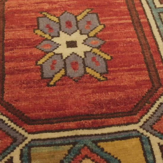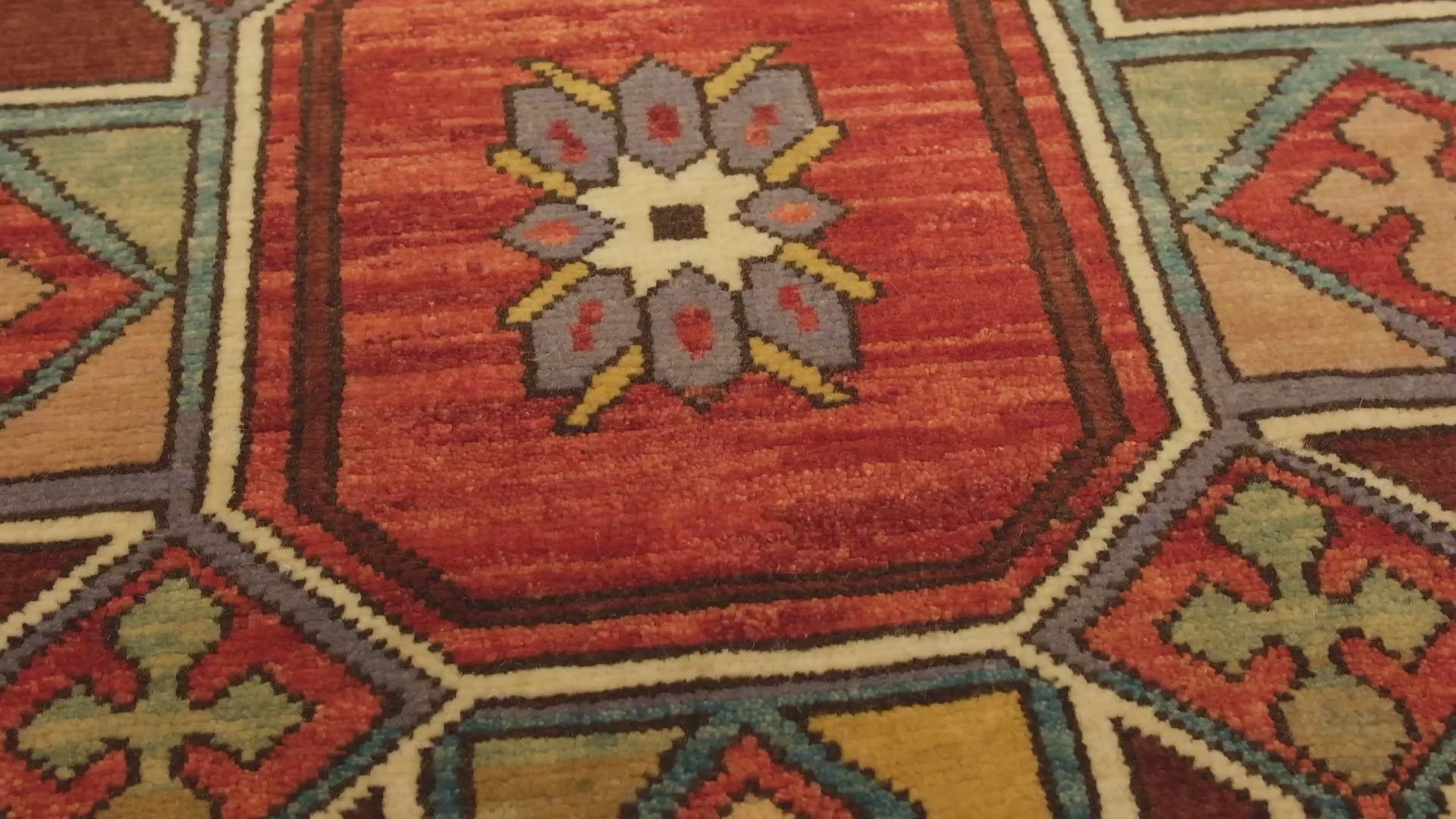 この絨毯は、伝統的な染色方法によって生み出された10色の自然色が調和しています。 Natural Wool Color 320: 羊そのままの色 Bistre Brown 411: ザクロの皮 - 茜 Khaki 413: ホザキモクセイソウ Burlywood 135: トウダイグサ - 茜 Raked Leaves 503: ヘンナ Maroon 433: 茜 Mandarian Orange 523: 茜 Dark Sienna 402: 茜 - ザクロの皮 - トウダイグサ - クルミの殻 Pale Green 439: カモミール - 藍 Dark Sky Blue 23: 藍