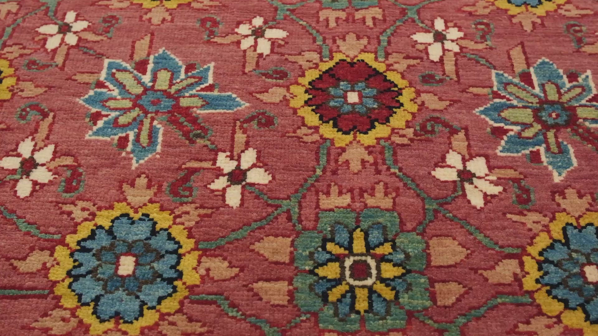 東トルコで手織りされたこのミナ・ハニ絨毯は、19世紀中頃のクルディスタン南部、コリヤーイ地域の伝統的なパターンを現代的に再解釈したものです。アスターの花が格子状に配され、蔓や花がこれを取り囲むデザインは、クルド地方の織り手たちの伝統に深く根付いています。新しく作られたこの絨毯は、伝統的な技法で手織りされ、マダーレッド(茜)、カリスマ(コチニール)、エメラルドグリーン(カモミールとインディゴ)、カデットブルー(トウダイグサとインディゴ)など、自然染料を使いながら、計11色の色彩で歴史的な芸術形式に新たな息吹を与えています。
