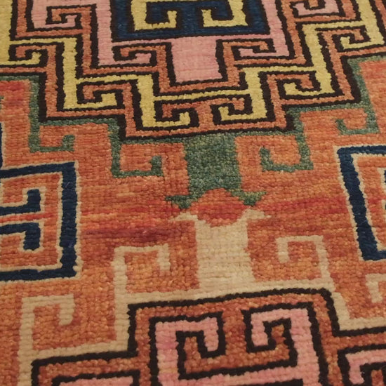 アララト絨毯の東トルコの熟練職人によって手織りされた「カザクのフック付きメダリオンラグ」をご紹介します。この現代的な再解釈は、19世紀後半のカフカス地方カザク地域の豊かな織物伝統から触発を受けて作られました。このラグは、それぞれのメダリオンに同心のフックモチーフを配し、中央には二重のラッチフックを配した目を引くデュアルメダリオンデザインが特徴です。これらのメダリオンを囲むのは、歴史的な魅力を高めるクラシックな「葉と花弁」のボーダーです。この作品に選ばれたパレットは、天然由来のダークブラウン(羊の毛)、茜根とヘナ、クルミの殻を組み合わせたファルレッドとコンゴピンク、染料草のカーキなど、伝統的な自然染料を使用した9色の鮮やかな色で構成されています。