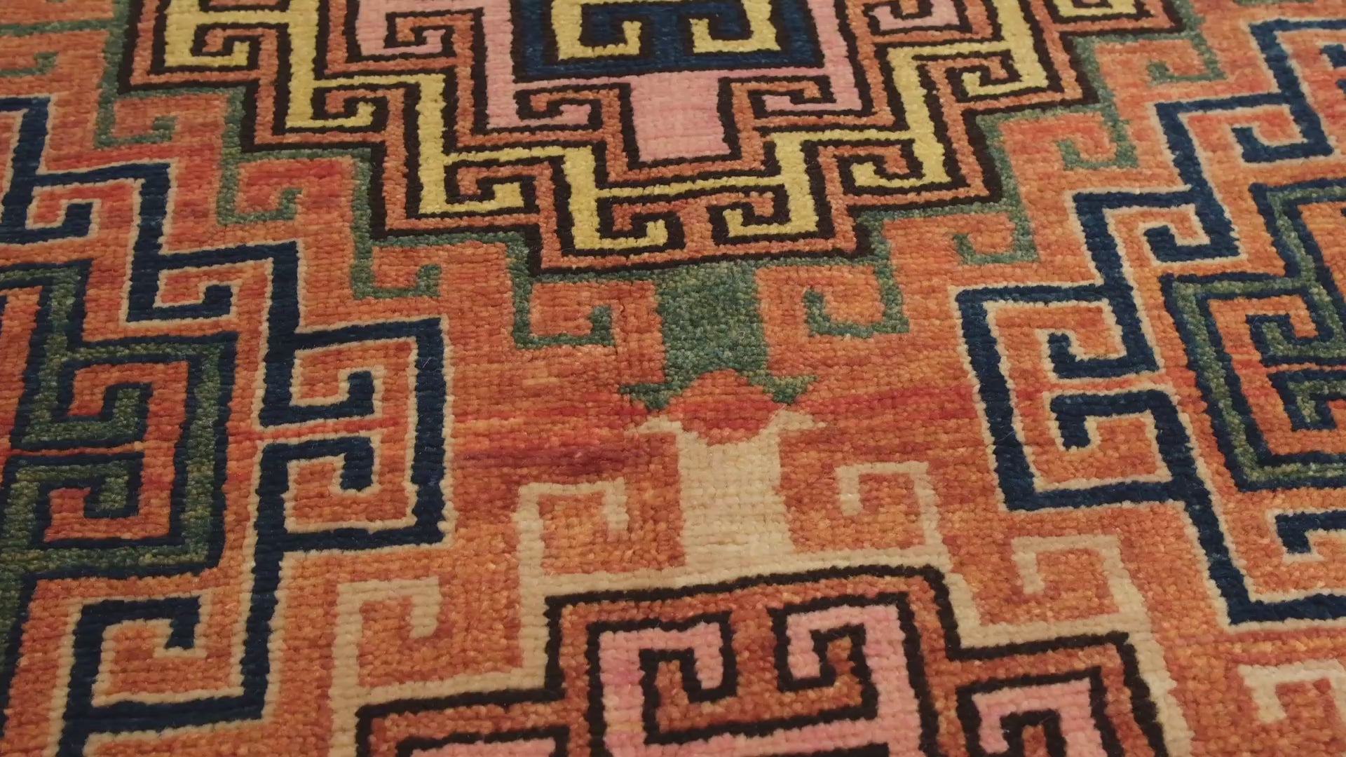 この絨毯は、伝統的な染色方法によって生み出された9色の自然色が調和しています。 Dark Brawn 316: 羊そのままの色 Khaki 413: ホザキモクセイソウ Burlywood 135: トウダイグサ - 茜 Cameo Pink 436: Synthetic Dye Congo Pink 306: 茜 Falu Red 400: 茜 - ヘナ - クルミの殻 Russian Green 418: ヘナ - 藍 Cadet Blue 26: トウダイグサ - 藍 Charleston Green 50: トウダイグサ - 藍