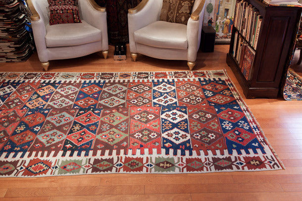 用途: リビングルームやベッドルームのアクセントラグとして、また壁掛けとしてもお使いいただけます。その独特のデザインと色彩は、空間に温かみと個性をもたらします。アンティークとしての価値が高い一品ですが、ぜひ日常生活の中で直接触れて、その魅力を感じていただきたいキリムです。