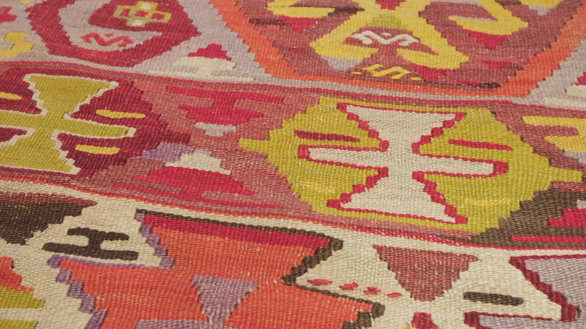 それに色合いの美しいこと!何系の色とは限定できない、明るいマルチカラーはこの織物を夢のようなキリムにしています。