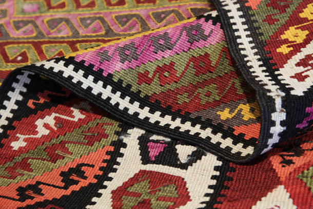 色使いが独特の、美しいオールドキリムは、トルコのカジズマン(カウズマン)という町のものです。