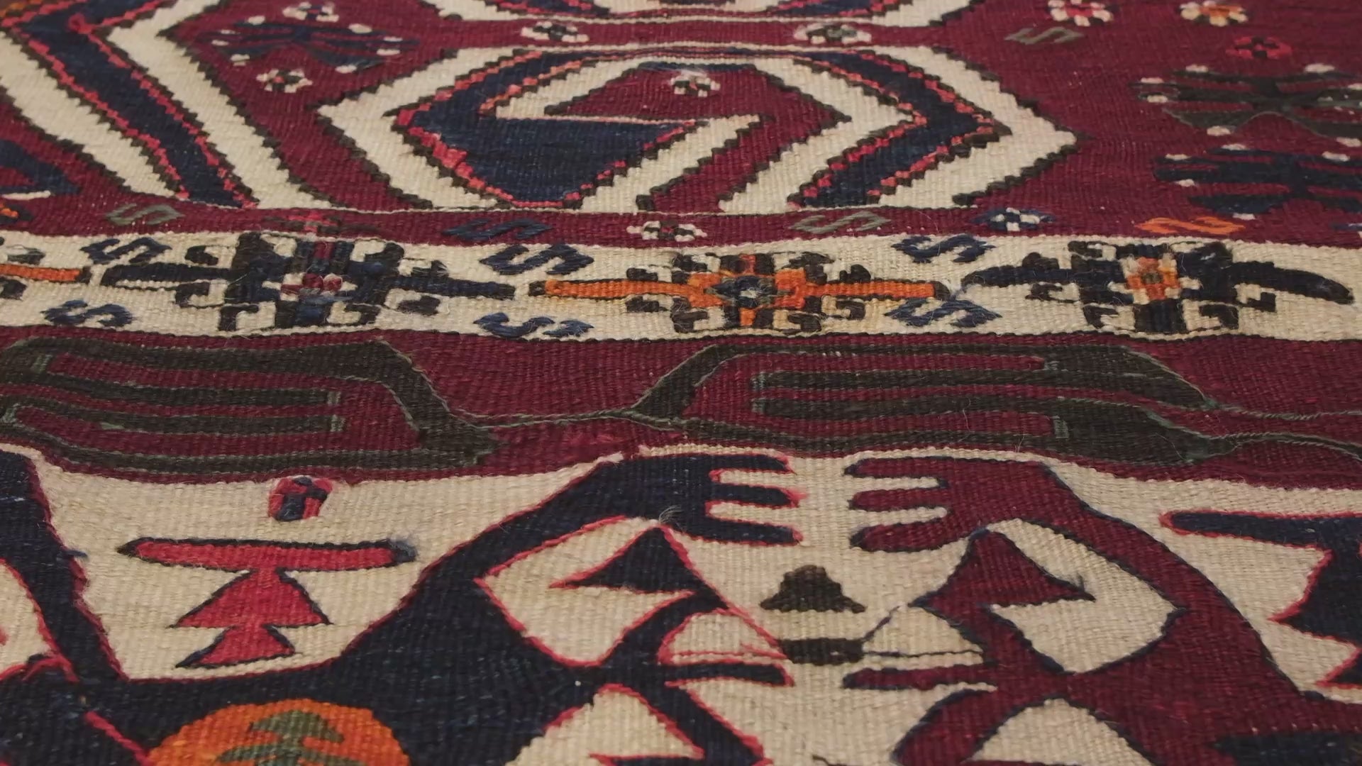 一見してわかりますが、それぞれの色が非常に美しいキリムです。メインとなる赤は深い色からオレンジに近い明るめの色まで、アブラッシュのよさを堪能できます。
