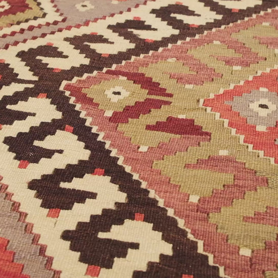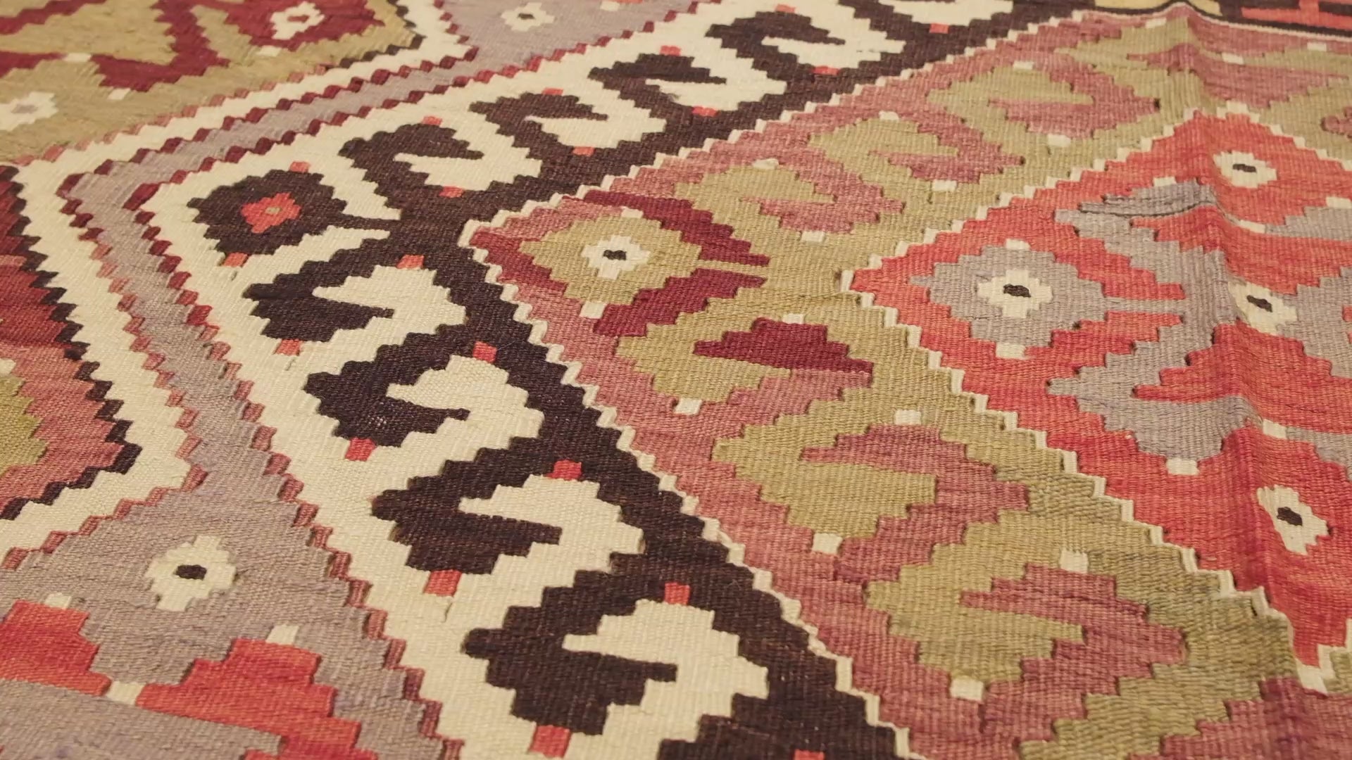 こちらのキリムは、整然と並んだメダリオンの模様がなによりも美しい一枚です。ひし形のメダリオンがいくつも並び、オールドの年代のアンタリアキリムのデザインの特徴の一つです。