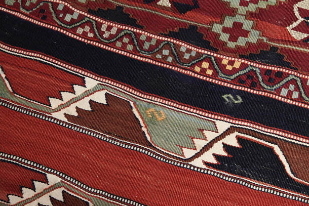 赤と濃紺、グレーがこのキリムの印象を決めている色です。他にも茶色や黄色、水色などが文様の中に用いられています。