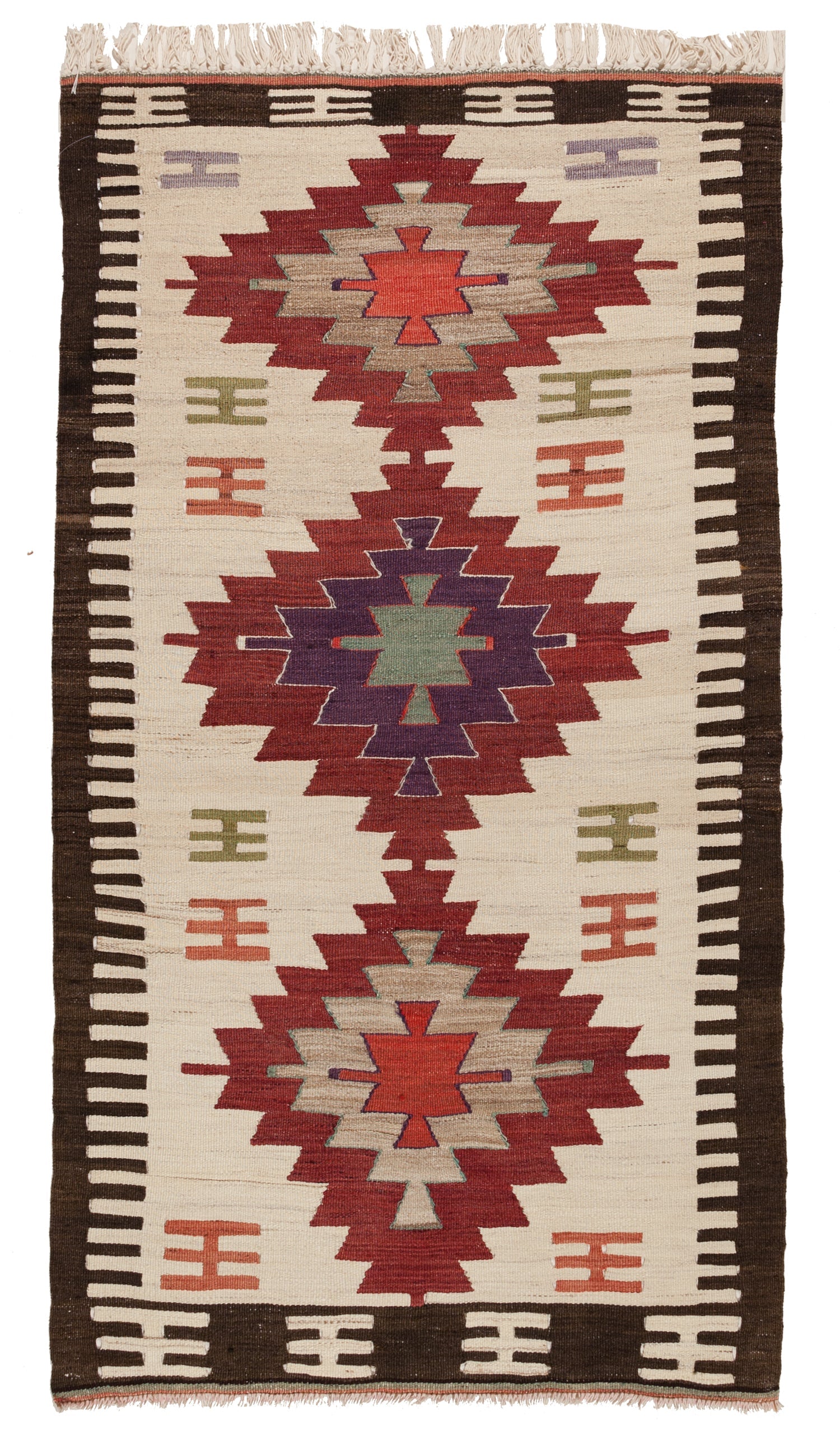 アメリカのネイティブインディアンの織物と非常に似ているといわれるムットのキリムですが、確かにそんな印象を受けるデザインや色使いです。