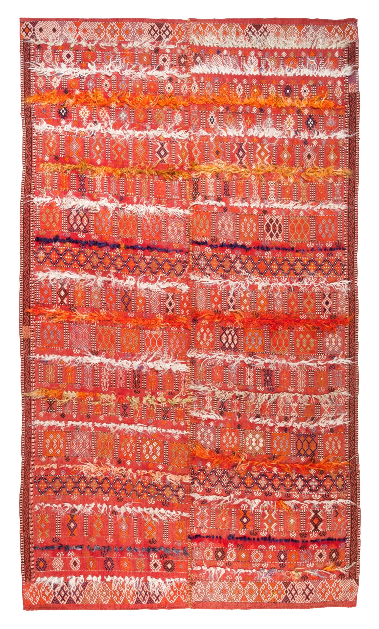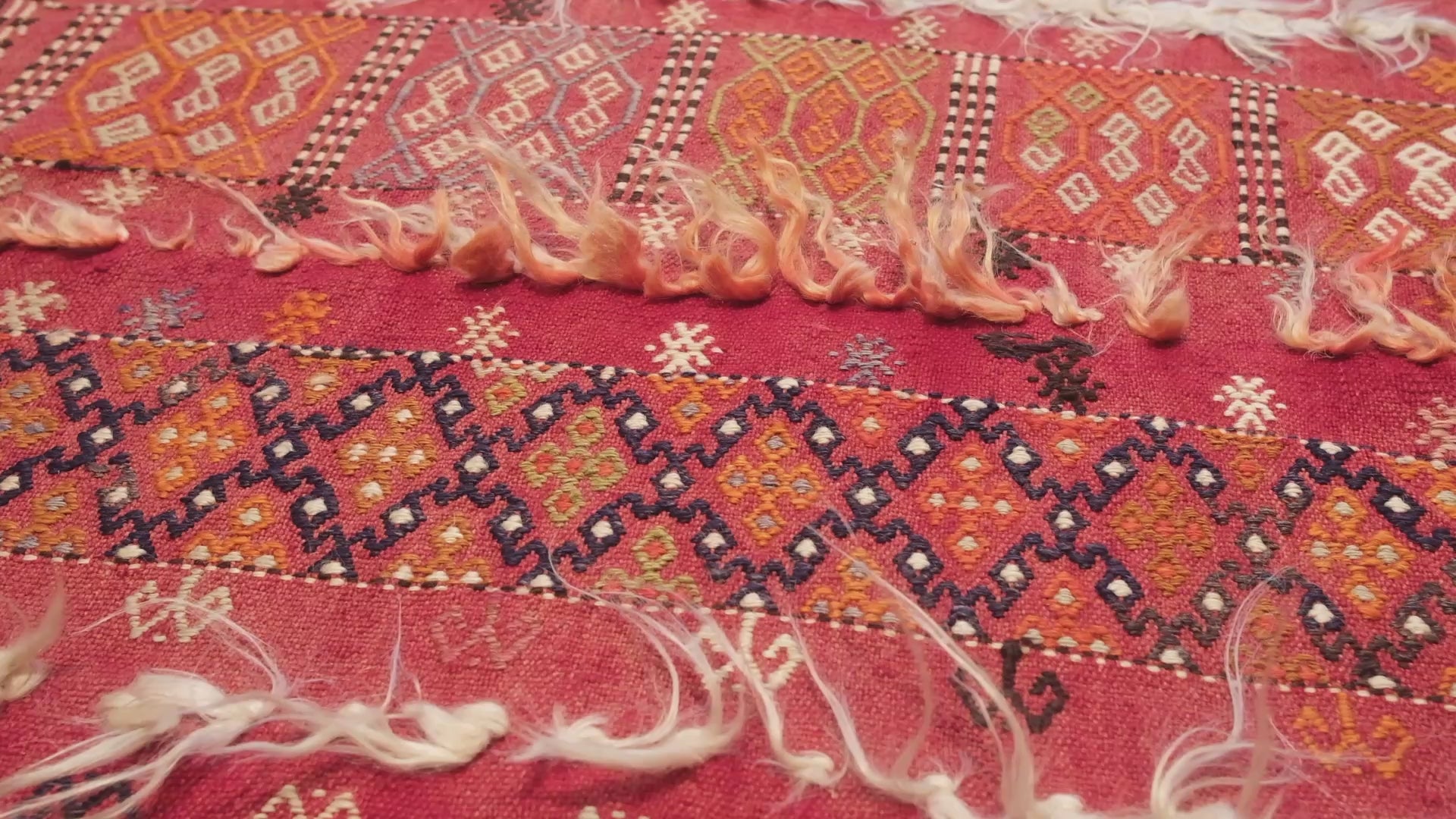 真っ赤な平織地の全面に、ジジムがほどこされています。パステルカラーに紺色を組み合わせたジジムは地織りの赤に映えて、万華鏡のように美しい文様です。