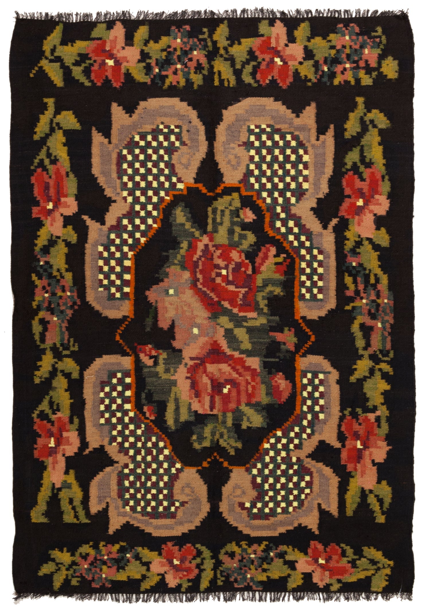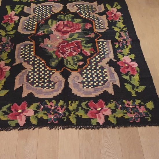 漆黒の地織りに花模様のベッサラビアキリムらしい一枚ですが、小さな野の花を集めてあしらったような可憐な 上下と左右のボーダーが、非常にかわいらしく心和ませてくれます。 中央のバラのブーケのような柄の周りを囲むレースのような装飾。その中は青味の深いグリーンで格子状の模様が織り込まれて います。さらにその中には生成りとボルドーで市松模様が。とても凝っていてユニークなデザインです。 このチェックがあることで、ややボーイッシュな雰囲気やカントリー調のかわいさも少し感じられます。 遠目には、花の花弁の白と、格子の中のぽつぽつとした白が、黒っぽい地に瞬いて見えます。