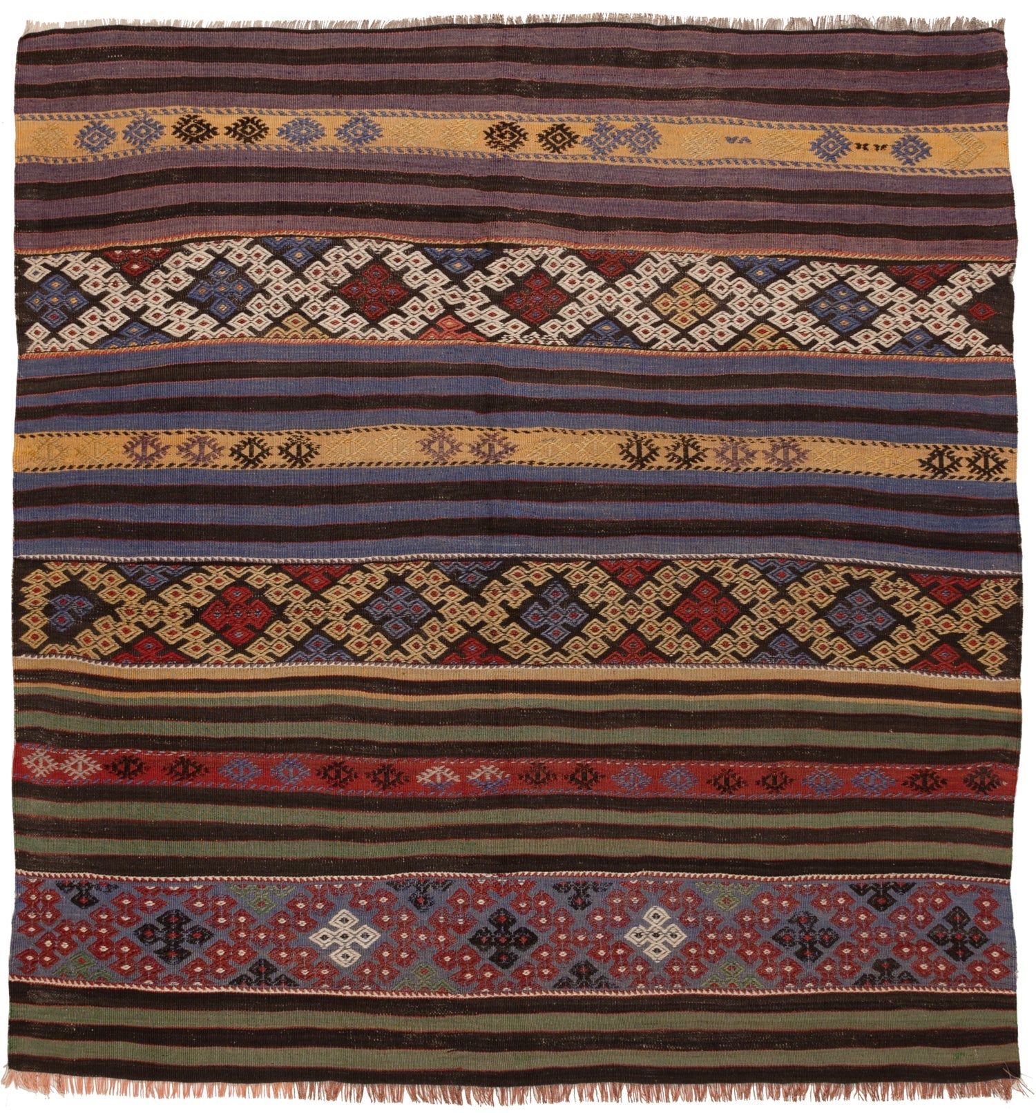 こちらは色使いがとても個性的なキリム。深めのトーンの色ばかりなのですが、不思議なカラフルさがあります。