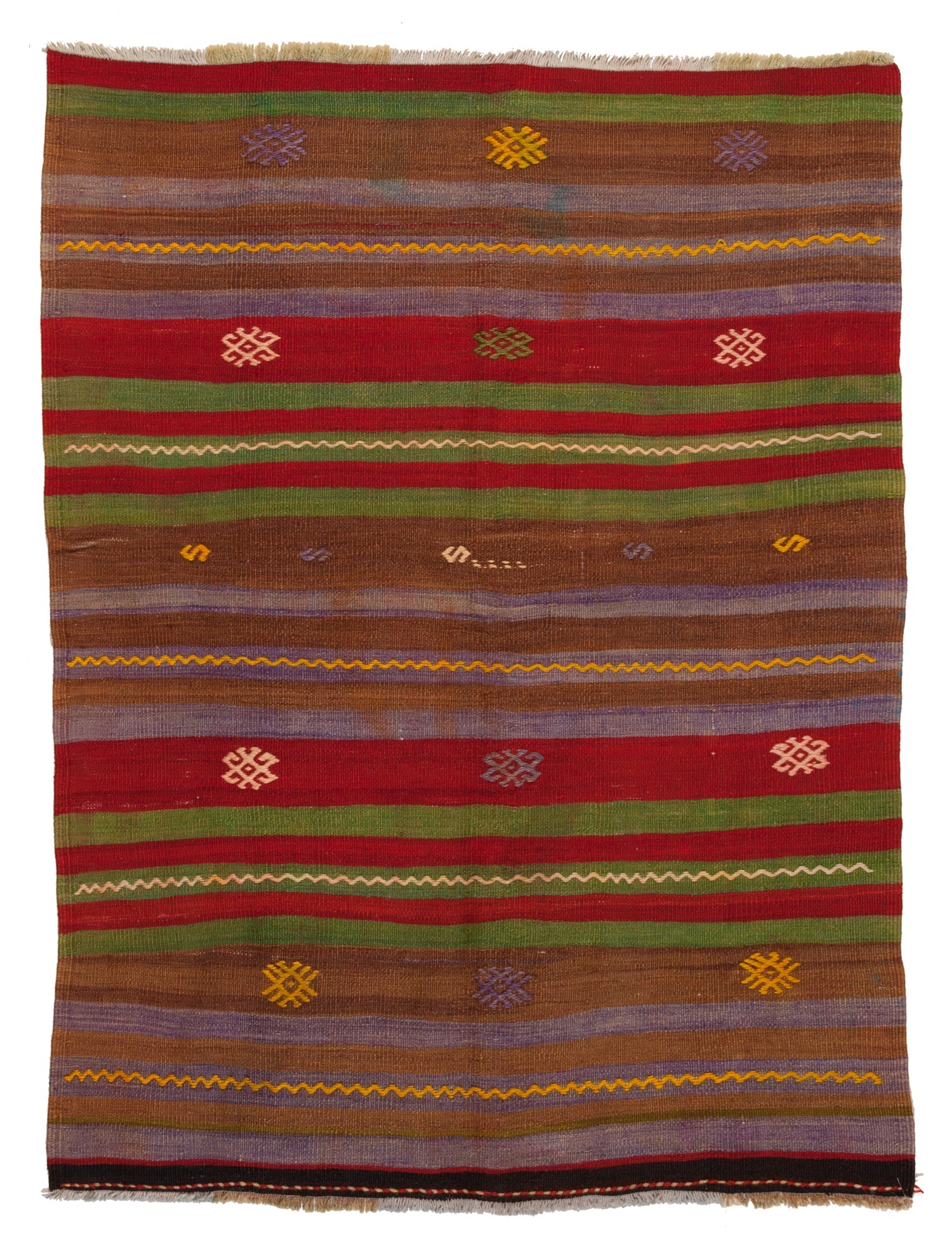 ウールの質感が活きた、落ち着いた淡めのブラウンをはじめ、紫や緑など、穏やかな褪せ感がほどよいオールドキリムです。
