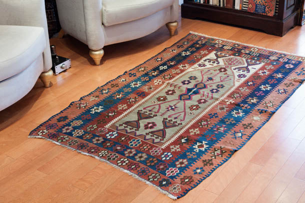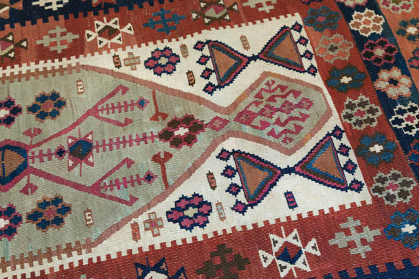 素朴で大胆でのびやかなタイプのキリムとは、また違う制限のある中での表現の美しさがあります。よりイスラム的な意識のもとで織られたからでしょうか。