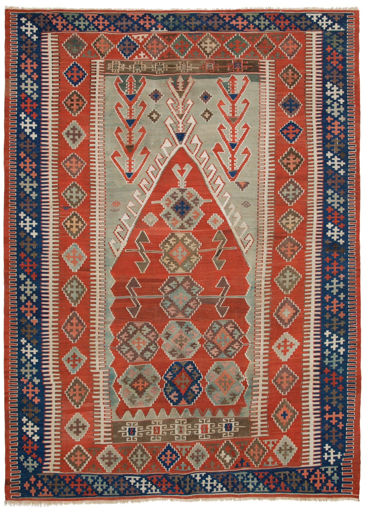 ひと目でそれとわかる、オブリュク特有のミフラーブ模様の礼拝用キリムです。