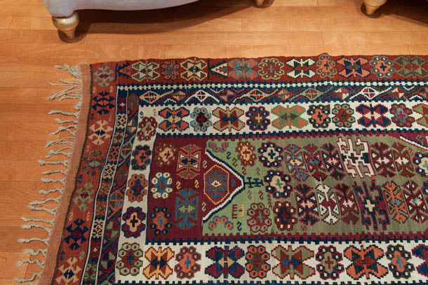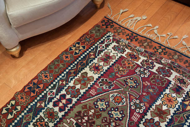 誰もがひと目で「美しい」と思え、心躍る色合いに惹かれずにはいられない、そんな魅力にあふれるキリムではないでしょうか。