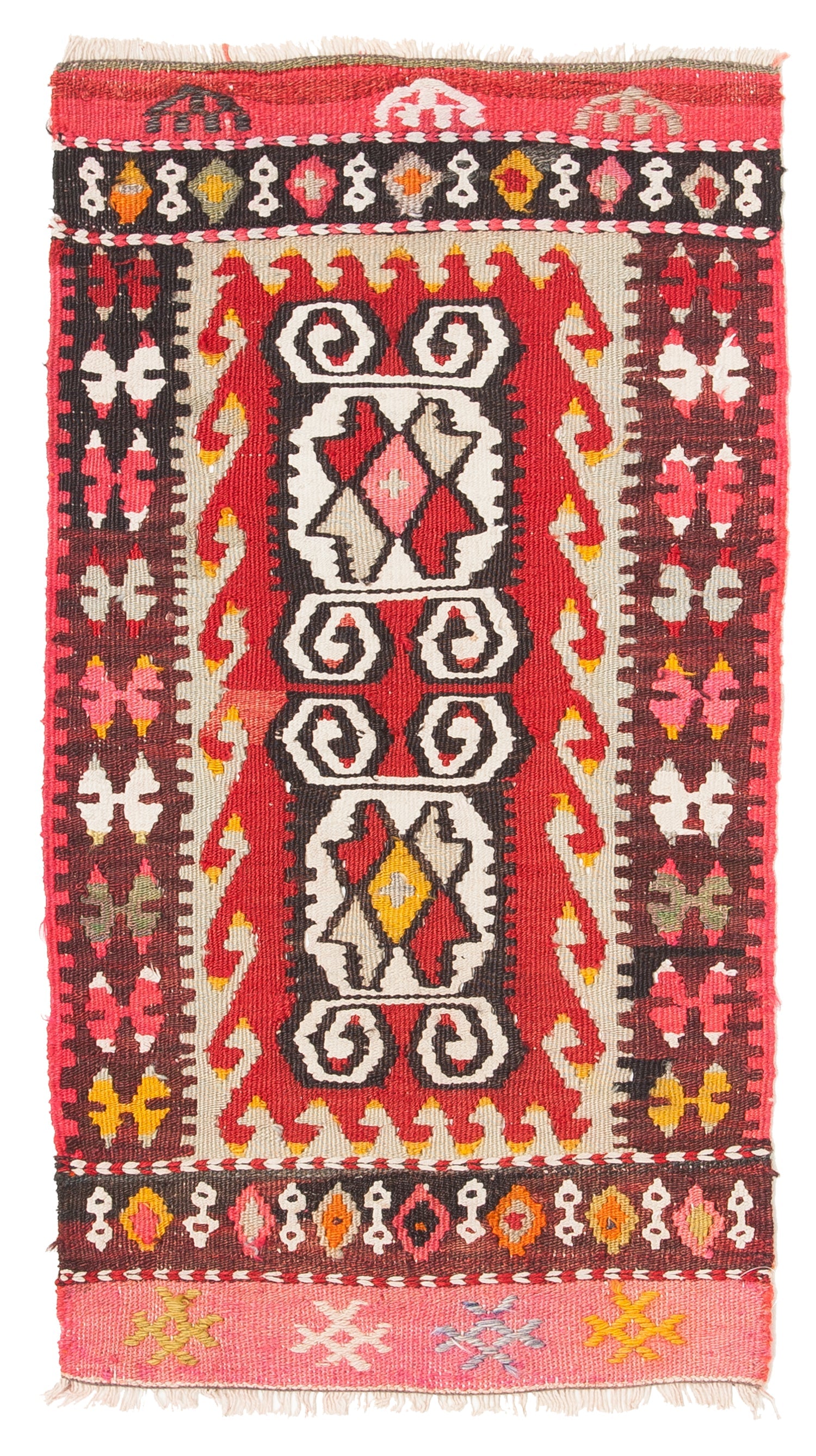 このアナトリア オールドキリム(品番:K25122)は、トルコのアナトリア地方で手織りされたオールドキリムです。サイズは48cm x 87cmで、素材はウールとコットンの混紡です。