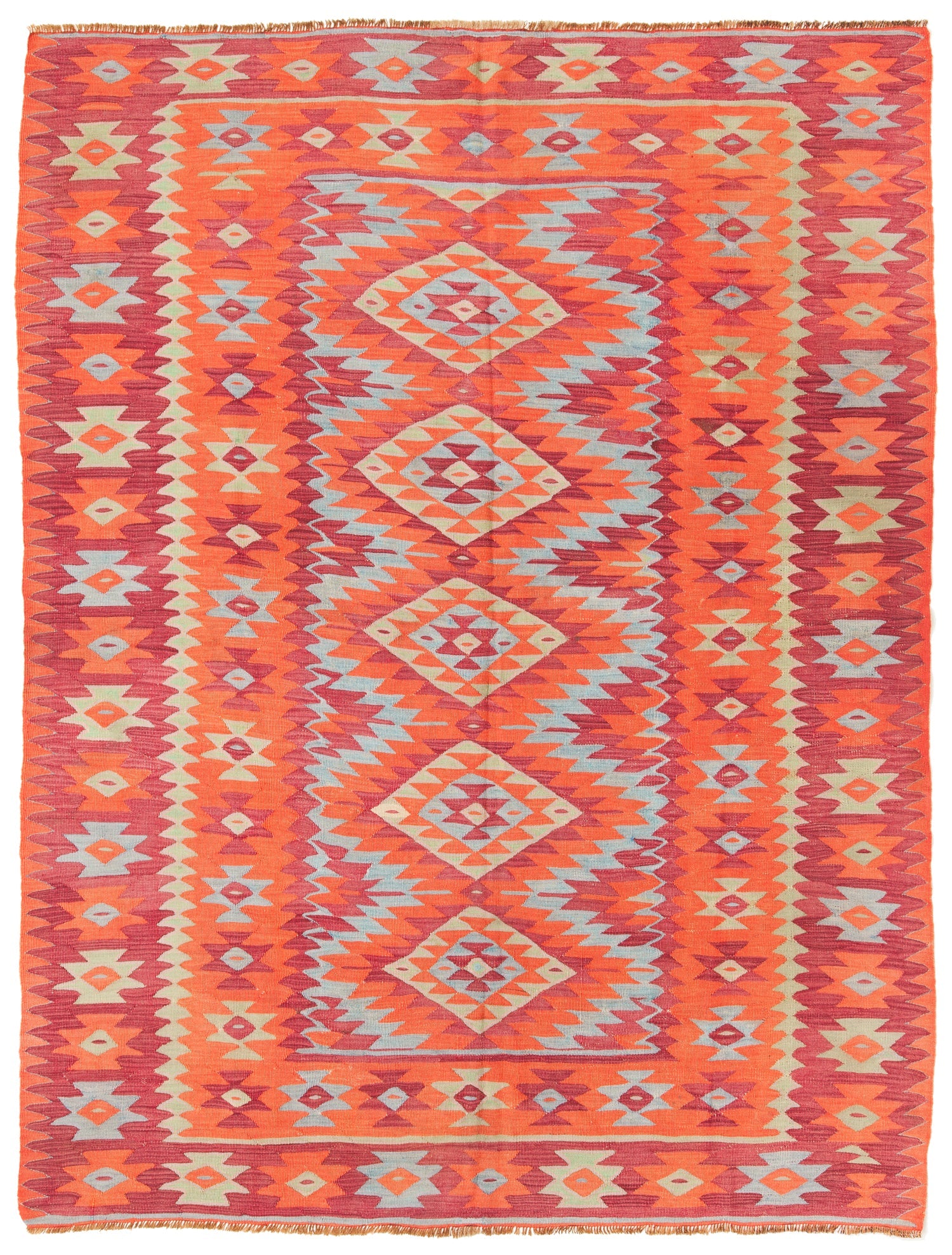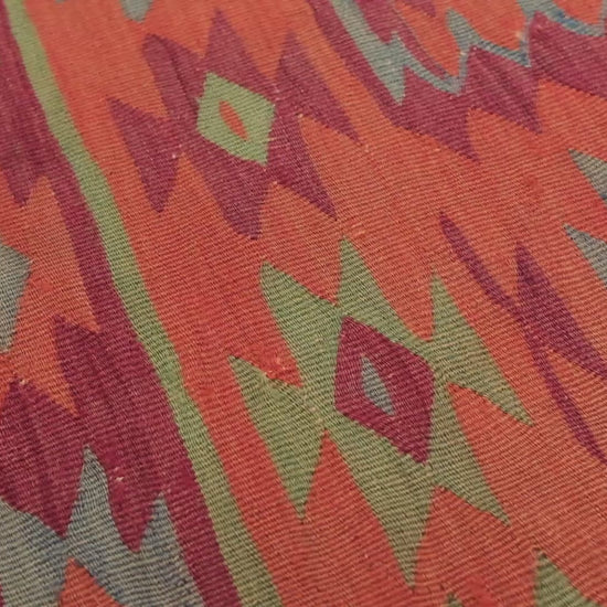 デザインと特徴: ダスクル地方のキリムは、鮮やかな色彩と幾何学模様が特徴です。このキリムは、深い赤や青、緑などの色調が巧みに組み合わされ、中央には大きな菱形のメダリオンが配置されています。周囲を囲む複雑なパターンは、地域の伝統的なデザインを反映しています。
