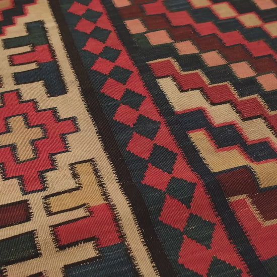 デザインと色彩: タリシュ地方のキリムは、細長いプロポーションと繊細な幾何学模様が特徴です。このキリムも例外ではなく、中央に配置された連続する菱形のメダリオンや、周囲を囲む複雑なパターンが目を引きます。色彩は、深みのある赤や青、緑が主体で、天然染料による鮮やかな発色が魅力です。