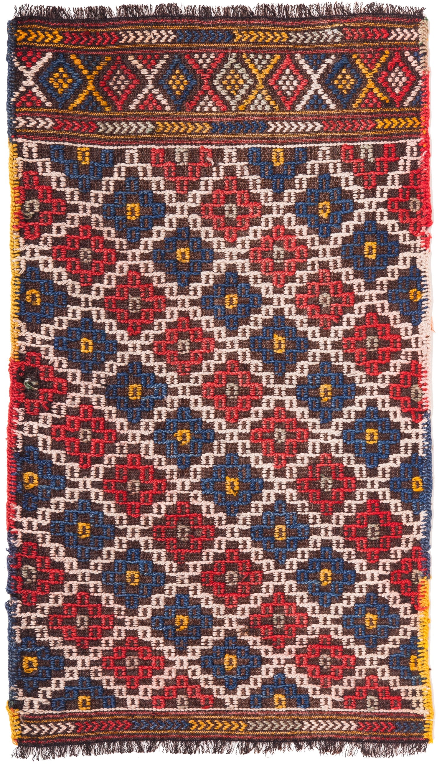 このアダナ オールドキリム(品番:K26072)は、トルコ南部のアダナ地方で手織りされた伝統的なキリムです。サイズは57cm x 96cmで、素材はウール100%が使用されています。元々は「ヤストゥク」と呼ばれるクッションの表面として使用されていたもので、独特のデザインと色彩が特徴です。