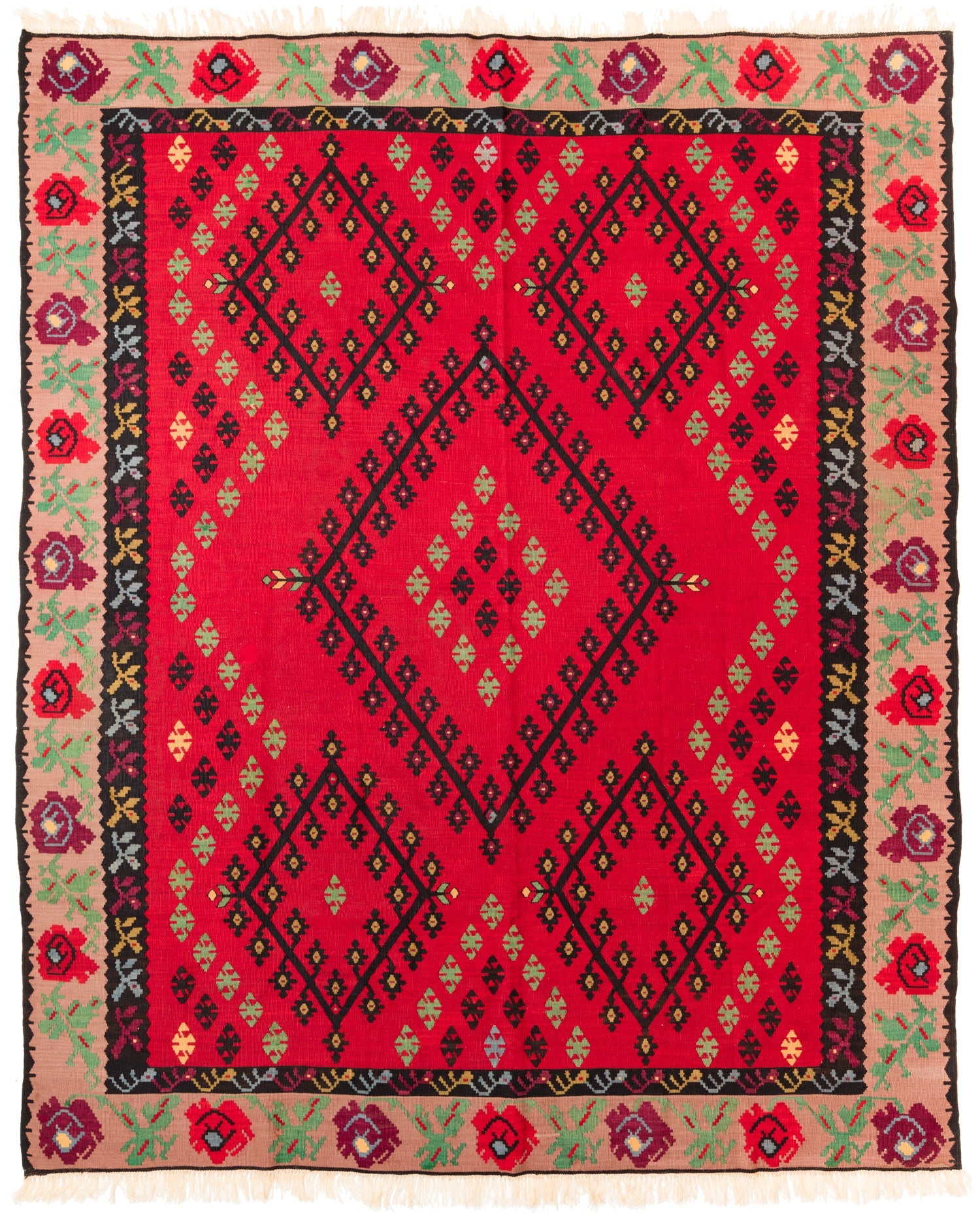 デザインと特徴: シャルキョイ地方のキリムは、鮮やかな色彩と幾何学模様が特徴です。このキリムは、深い赤や青、緑などの色調が巧みに組み合わされ、中央には大きな菱形のメダリオンが配置されています。周囲を囲む複雑なパターンは、地域の伝統的なデザインを反映しています。