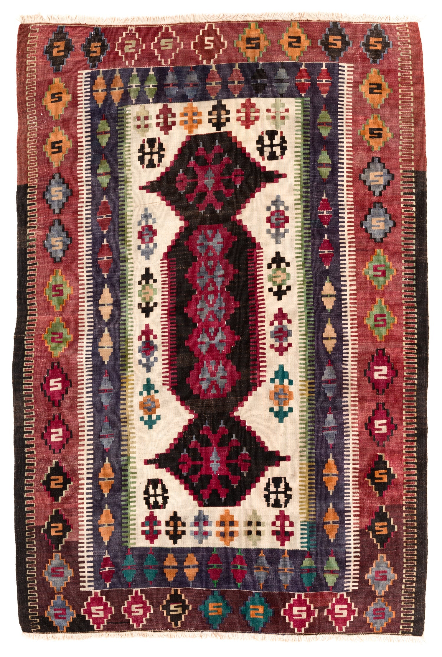 デザインと色彩: オブルックのキリムは、独特の幾何学模様と鮮やかな色彩が特徴です。このキリムは、深い赤や青、緑などの色調が巧みに組み合わされ、中央には大きな菱形のメダリオンが配置されています。周囲を囲む複雑なパターンは、地域の伝統的なデザインを反映しています。